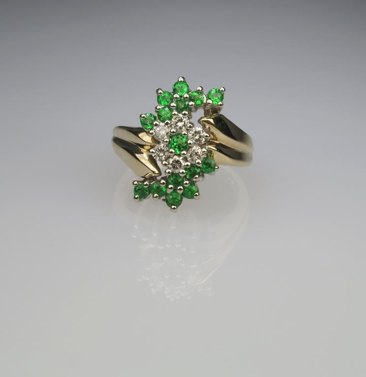 Graceful "LEVIAN" Flower Design Tsavorite Garnet and Diamond Ring with 15 Fine round cut Tsavorite Garnets and 5 round cut Diamonds weighing approx. 1.00 carat total set in 14 karat yellow gold. Retail $1,500-$2,000 Estimate $800-$1,200.