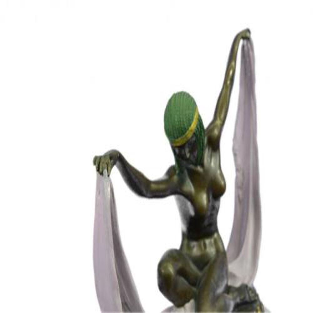 With extreme grace and expertise this dancer strikes her beginning pose. She bows her head and holds a long yellow sash, that stretches from arm to arm. She sits on the soles of her feet, folding her nude body slightly. Her hair is a green patina with a gold headband. The colors compliment her brown patina skin tone. The careful details allow you to see the line of her rib cage as she breathes calmly. She is silent as she waits for her enchanting performance to begin. This sculpture was cast using the Lost Wax Method and mounted on an marble base. Bronze Dimensions with Marble Base: Height 10 X Width 12 Inches. Weight: 11 LBS.