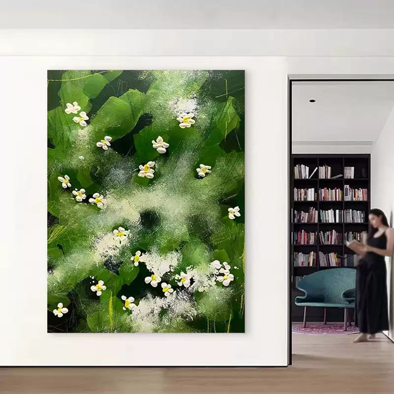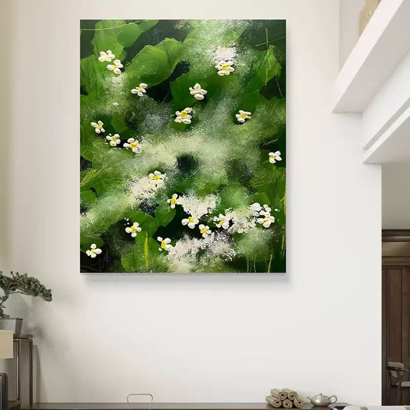 Amidst the fresh green leaves, delicate white flowers bloom, reminiscent of a spring morning where the air is filled with the fragrance of flowers and fresh greenery. The tiny petals sway gently in the breeze, while the surrounding leaves dance with the wind, creating a vibrant and tranquil natural scene. Dimensions: 24 x 31 inches.