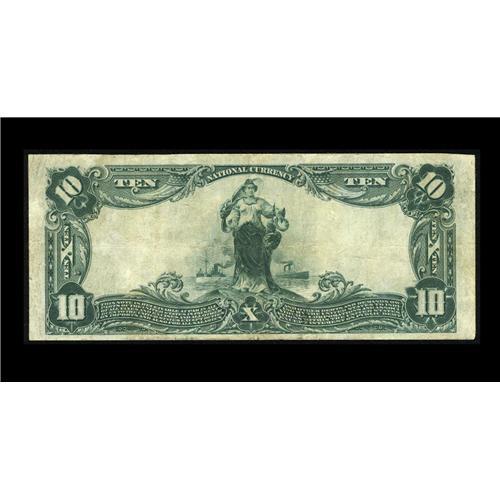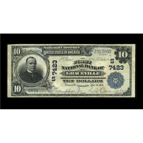 <B>Graceville, FL</B></I> - $10 1902 Plain Back Fr. 624 <B>The First NB</B></I> Ch. # (S)7423<BR>This note is not in the census of 8 large for this bank. In fact our research can find only one auction appearance in large for this bank and that was in our January 1992 auction. We do know that a small size circulated note on this bank has broken the $2700 barrier in our January 2003 auction. This leads us to believe that this delightful <B>Very Fine</B></I> with purple signatures will entertain bids in the range of...<BR><BR><b>Shipping:</b> Coin/Currency (<a target="_blank" href="http://www.heritageauctions.com/common/shipping.php">view shipping information</a>)