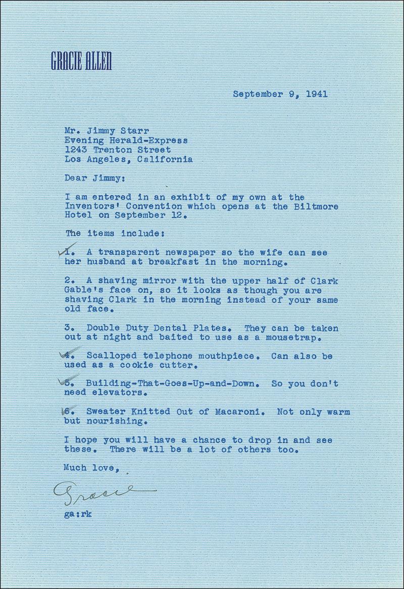 Humorous TLS signed “Gracie,” one page, 7.25 x 10.5, personal letterhead, September 9, 1941. To screenwriter and columnist Jimmy Starr. In full: “I am entered in an exhibit of my own at the Inventors’ Convention which opens at the Biltmore Hotel on September 12. The items include: