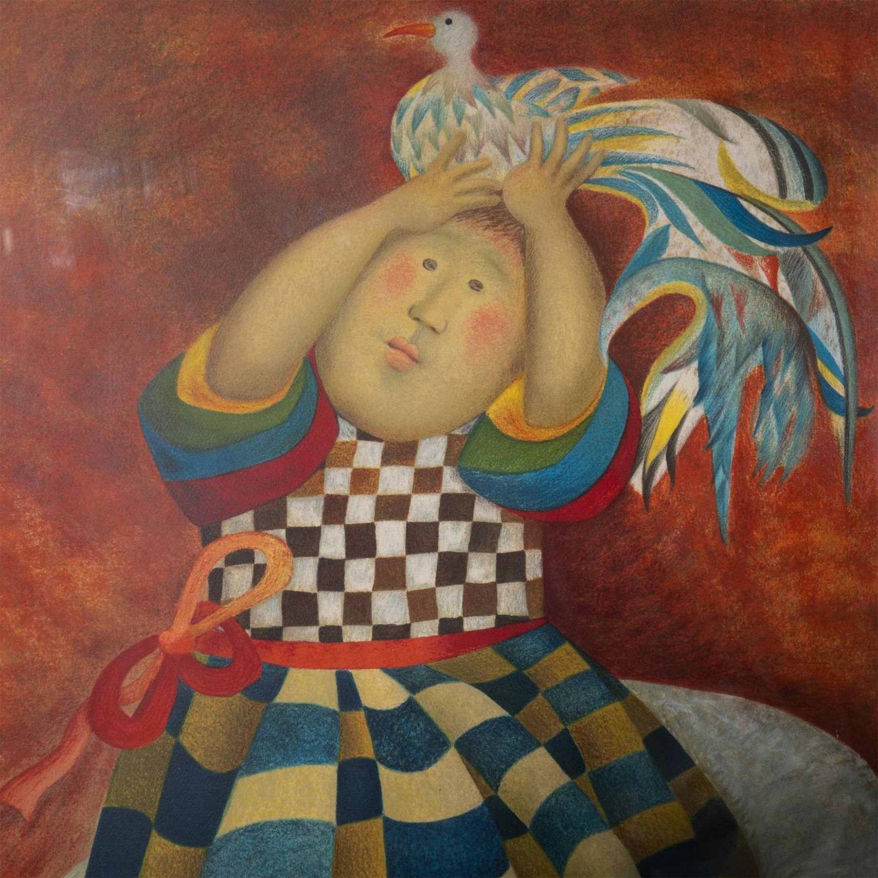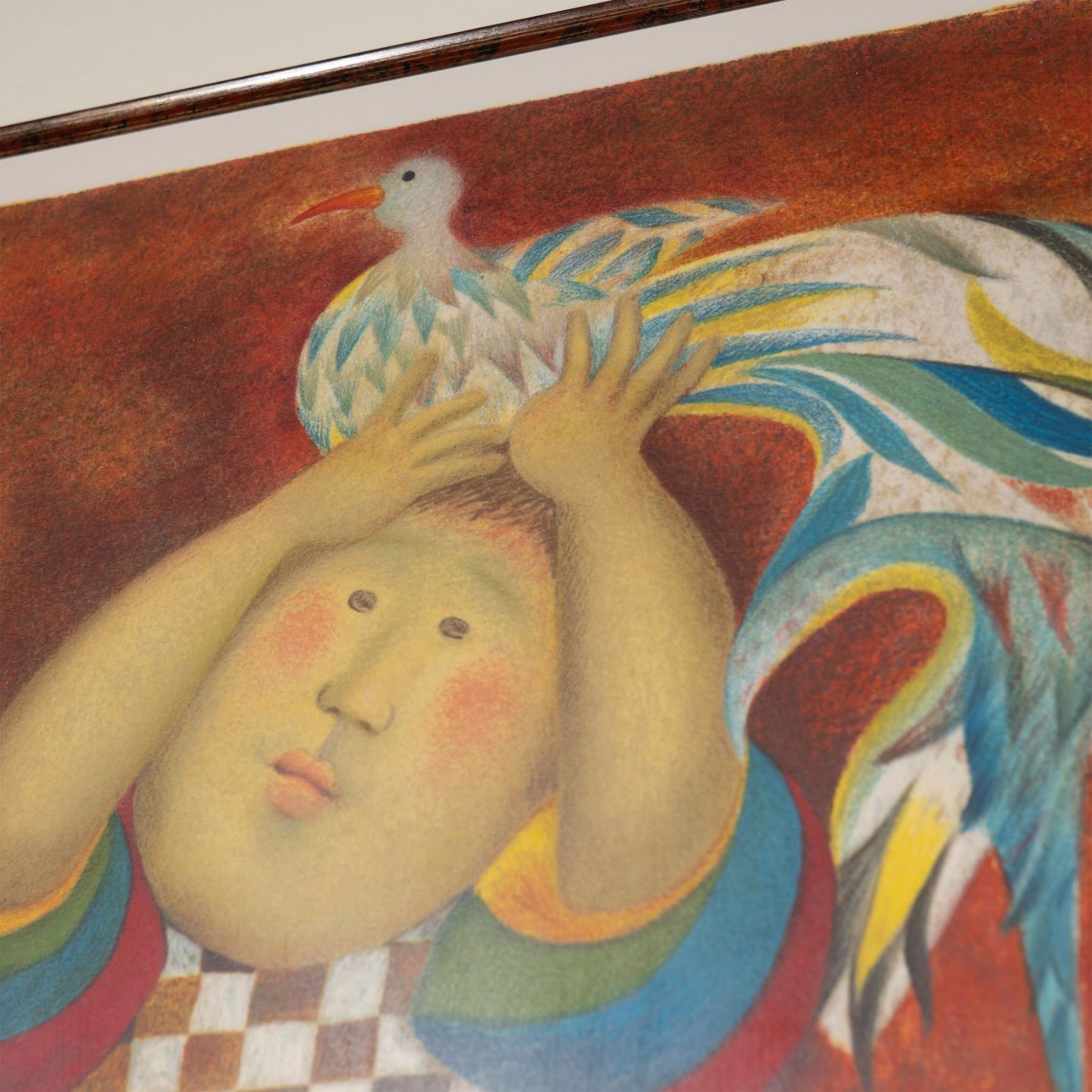 Original color lithograph on wove paper entitled l'Oiseau (also known as The Ostrich) by artist Graciela Rodo Boulanger. She depicts with vibrant colors a young child who holds a bird with long feathers above the head. Signature in pencil on lower right: G. Rodo Boulanger. Edition number on lower left: 82/200. Housed in a carved wood frame with an off-white mat. Sight size: 28.75"L x 41"H. Frame dimensions: 39"L x 51.50"H x 2"W.