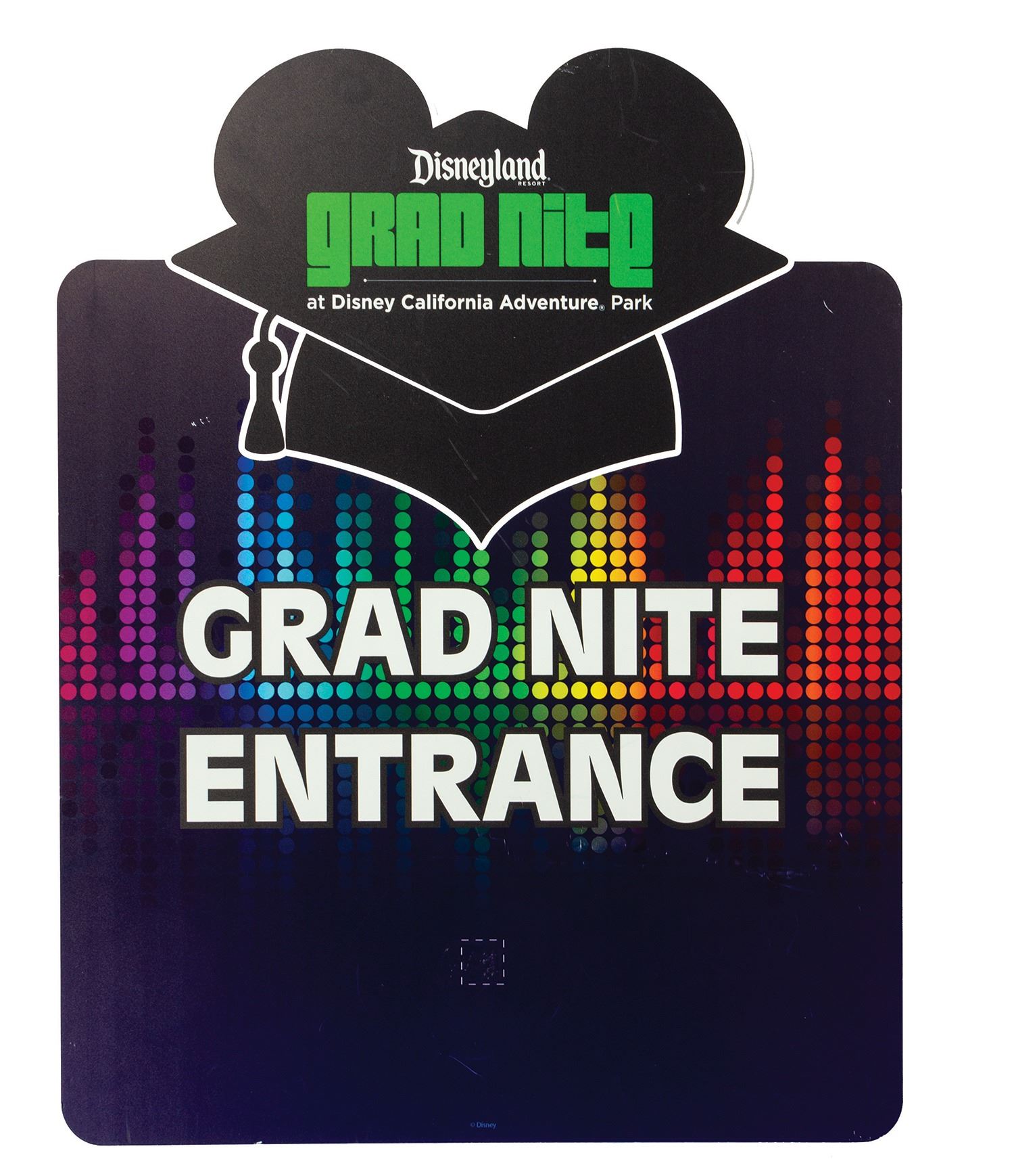(California Adventure, 2019) A large sign from the entrance to the 2019 Grad Nite events at California Adventure. Printed on thin metal that is backed with dense foam, the sign measures 25"x20" and is in fair condition with surface scuffs throughout from use. There is a small square near the bottom where an arrow would be attached to designate the entrance direction. The verse has two velcro strips from its original use.