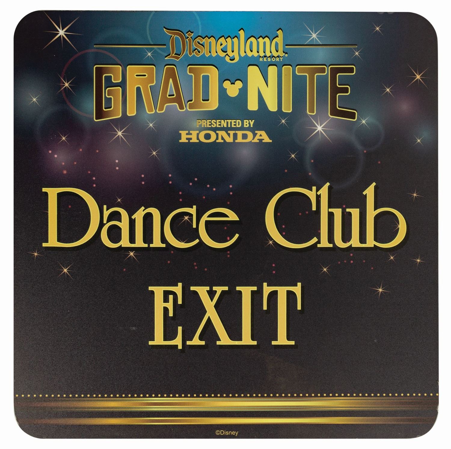 (California Adventure, 2014) A sign from Disneyland Resort's Grad Nite events during 2014. The sign was used at the event to designate the exit of the Dance Club area. Printed on PVC board, the sign measures 20"x20" and is in good overall condition with some surface scuffs from use.