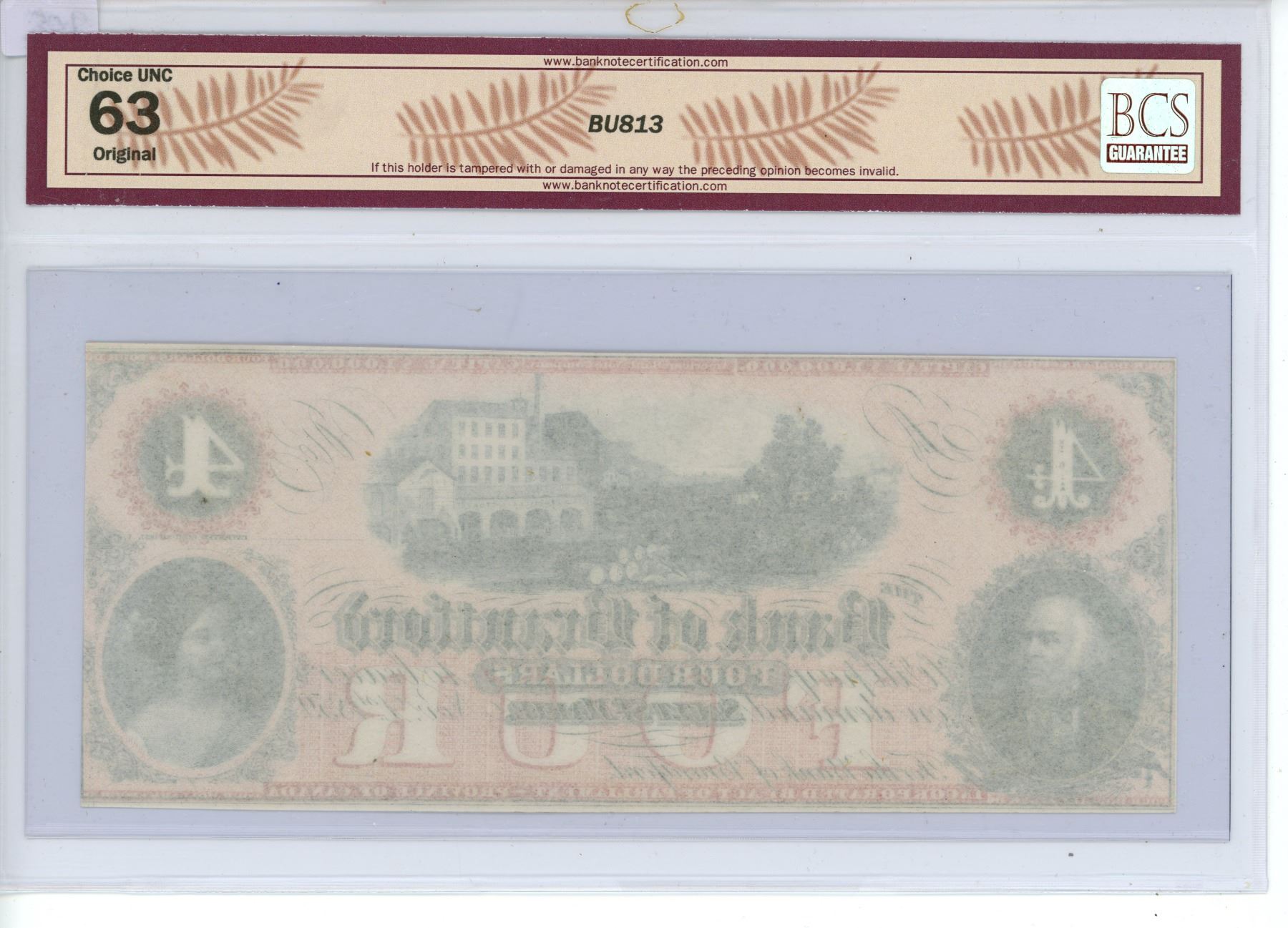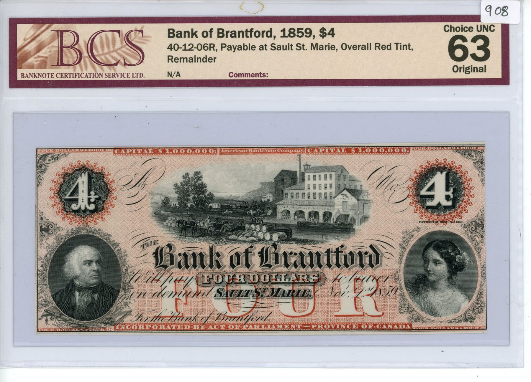 Graded 1859 Bank of Brantford $4 bill - Choice UNC 63
