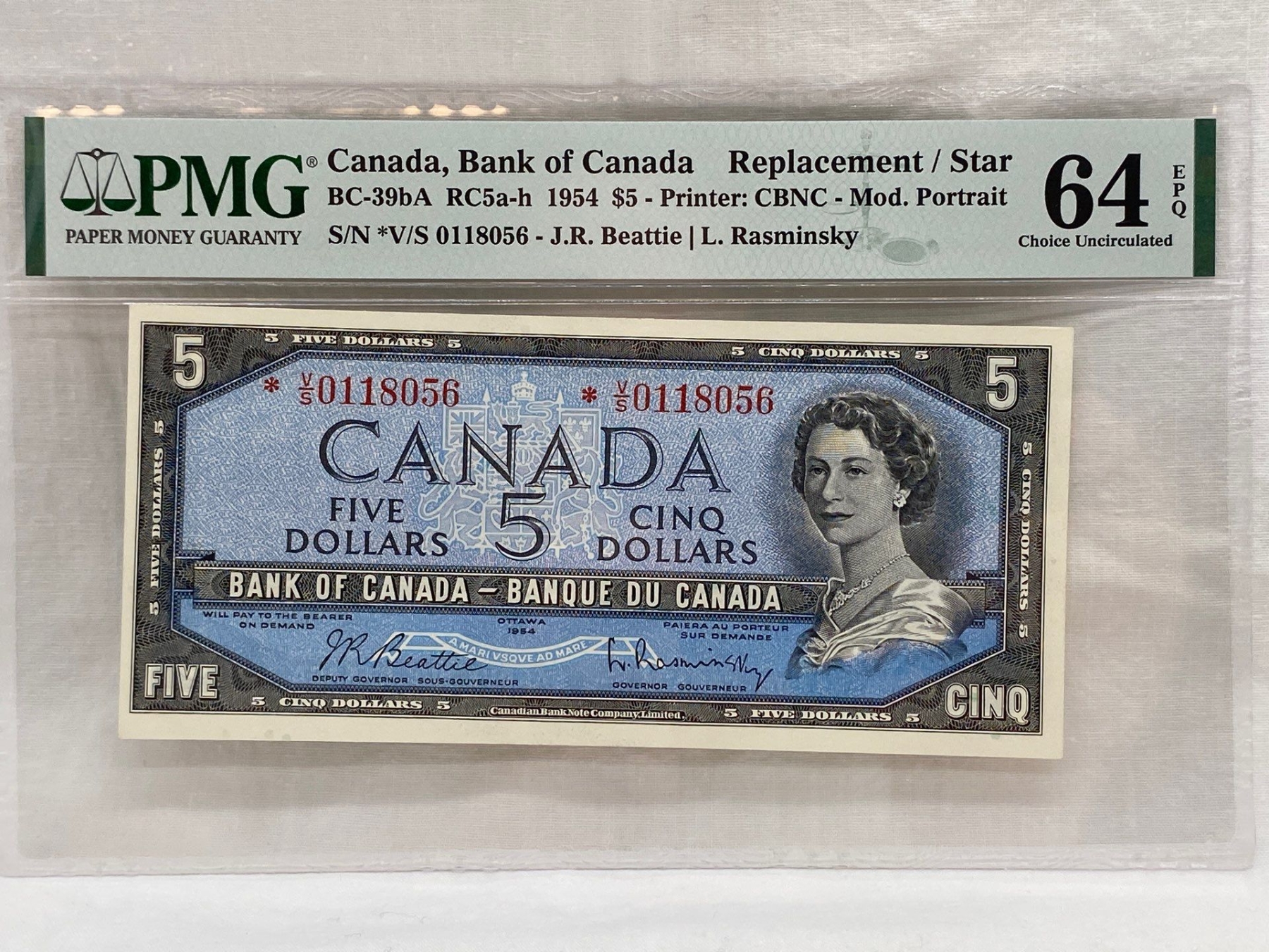 Graded Canadian 1954 $5 Mod. Portrait Choice UNC Prefix: *V/S