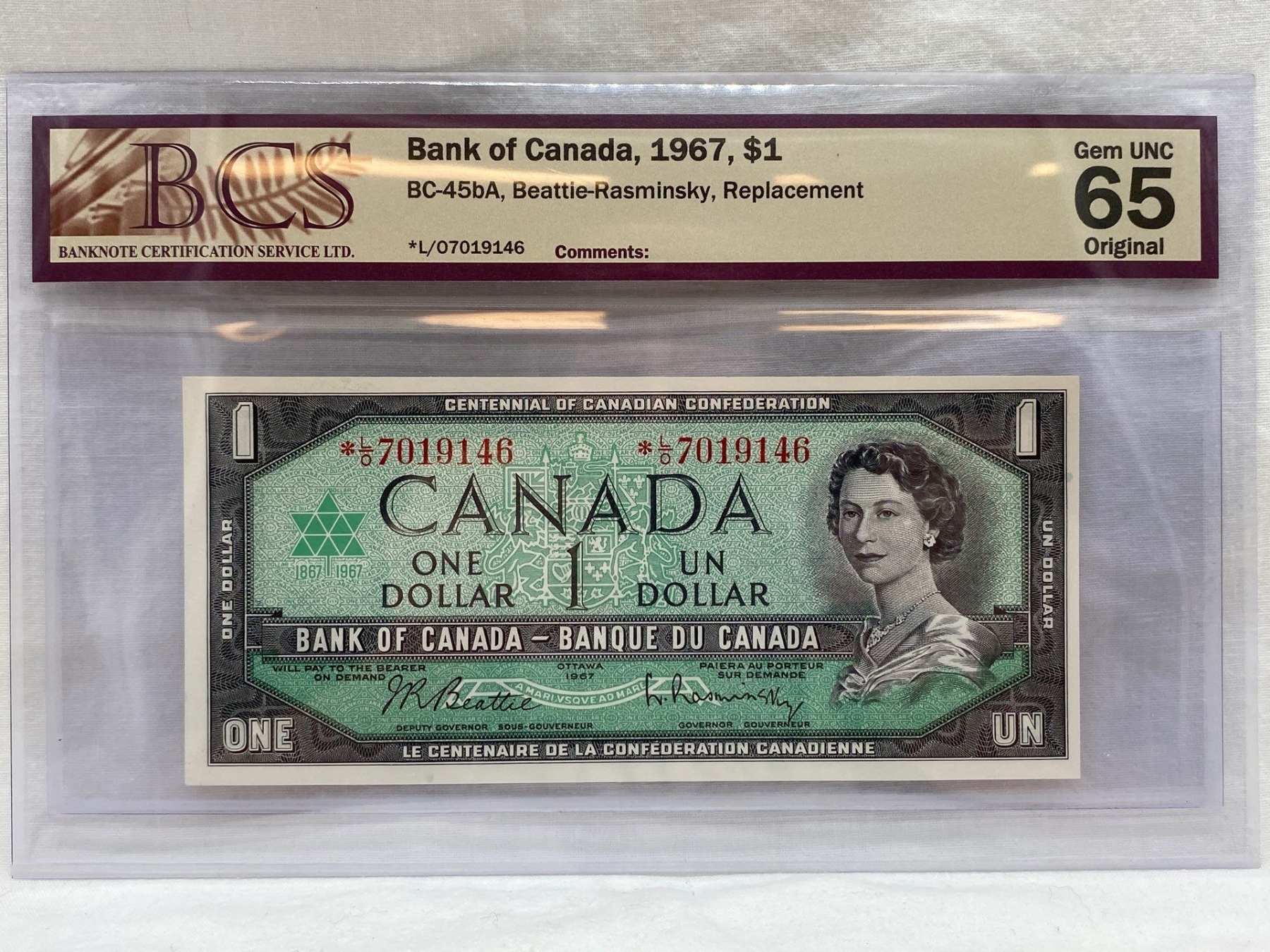 Graded Canadian 1967 $1 Gem UNC Prefix: *L/O