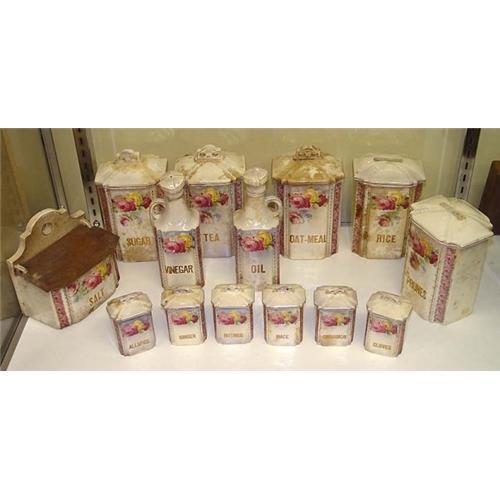 Nice size set 14 Pieces in all, with matching flower pattern adornments, includes Salt, Sugar, Tea, oat-mael, Rice, Vinegar, Oil, Prunes, Allspice, Ginger, Nutmeg, Mace, Cinnamon and cloves.