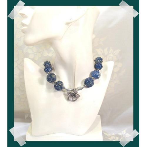 A remarkable artisan creation for those that adore the charming deep hues of mother earth's treasures. The center floral bead has a diameter of 29mm while the lapis melons are graduated in size. The largest have measurements up to 23mm in the center. For those not familiar with metric 25mm=1". The choker has a length of 17" with a very impressive gram weight of 158. Sure to very quickly become your favorite accessory....