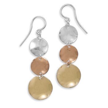 Sterling silver, rose and yellow gold plated graduated triple disc earrings. Discs measures from 12mm - 16mm. .925 Sterling Silver