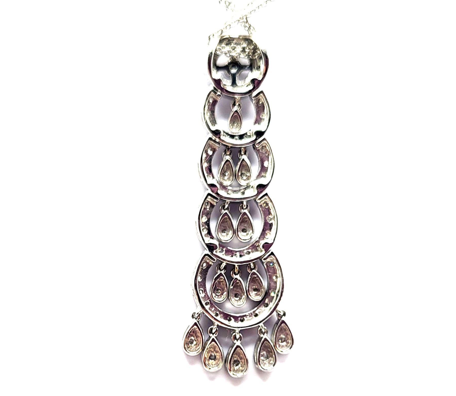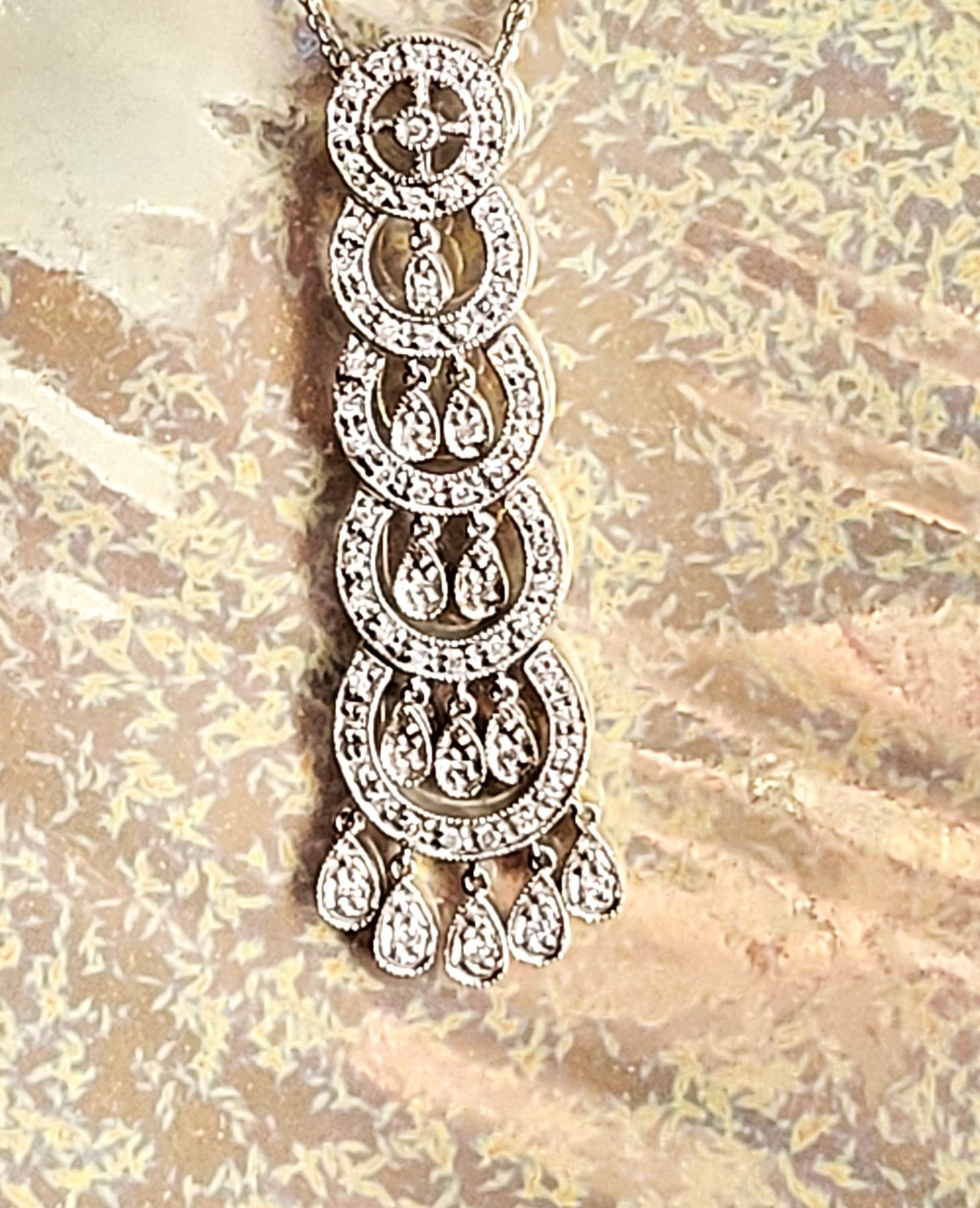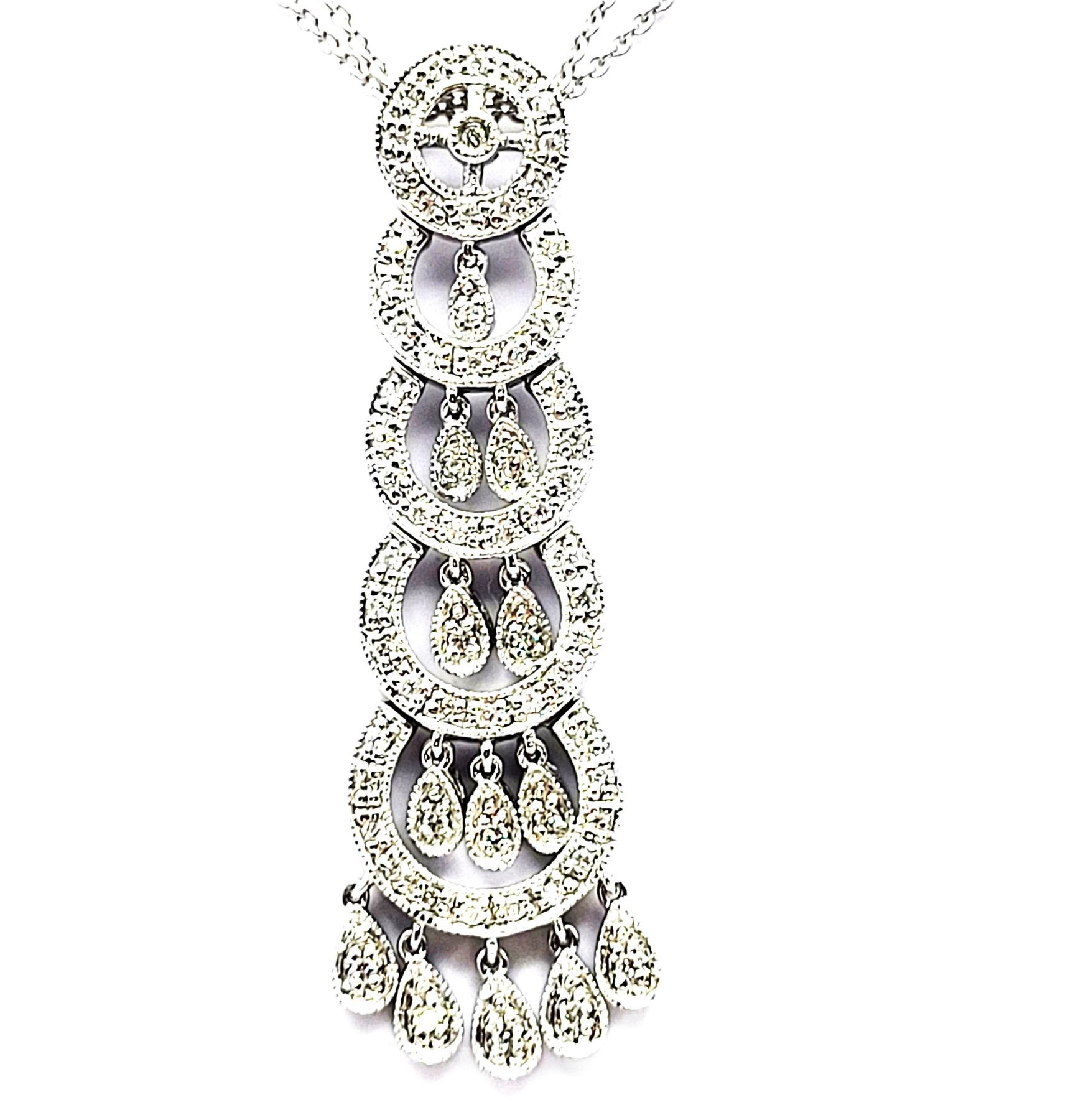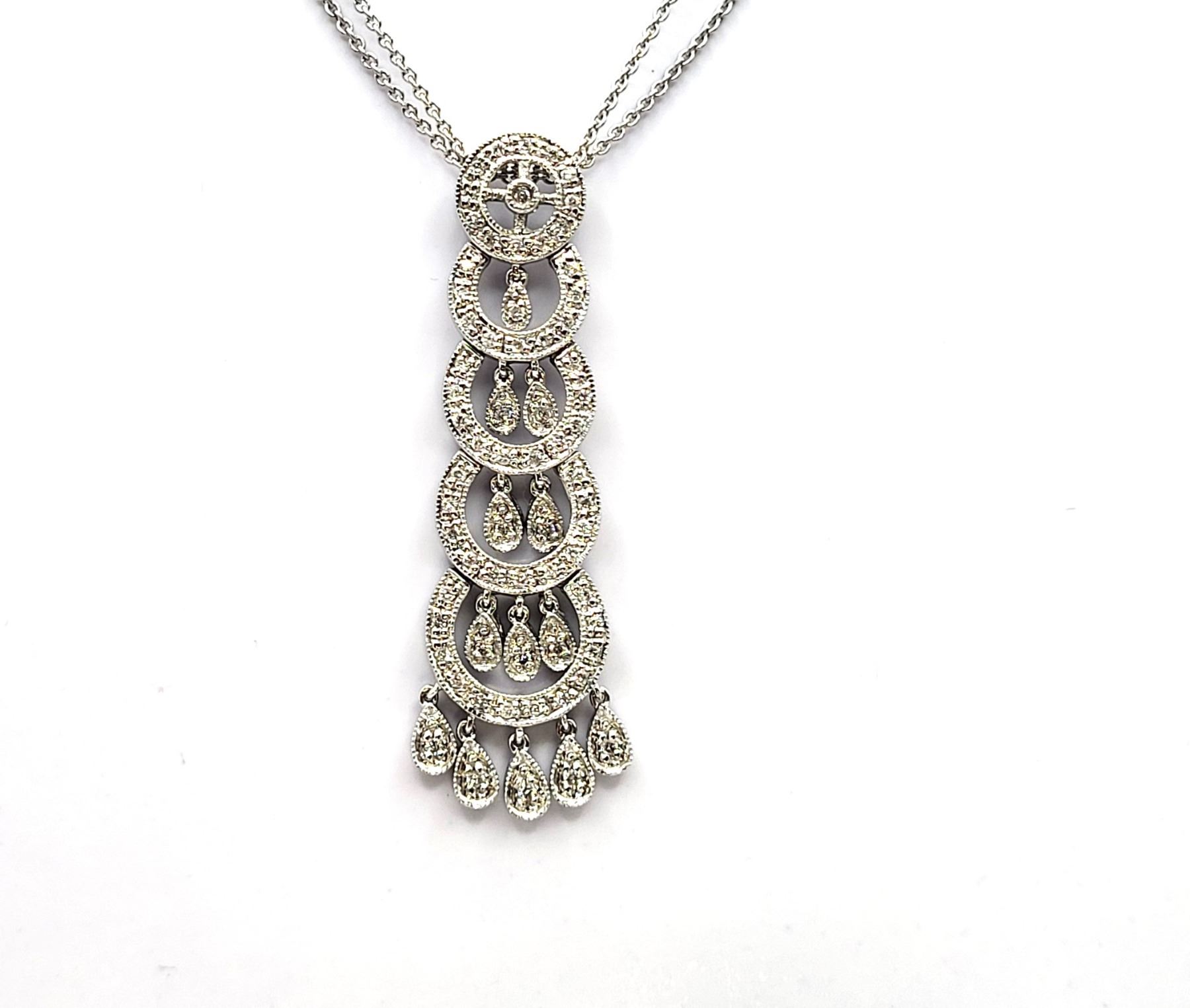This is a 14 karat white gold necklace that features a 2& quot; pendant with fashionable concentric circles, postured vertically, increasing in size from the top to bottom. There are .40 carats total weight of round, brilliant-cut, H color, SI2-I1 clarity diamonds along the pendant in the borders , inside the circles, and on the dangling fringe. This eye-catching pendant hangs from a 16& quot; 14 karat white gold fine link double chain by a slide-style hidden bail with approximate openings of 2.4mm. The chain has a lobster clasp. Auction Code: G11241/42ent