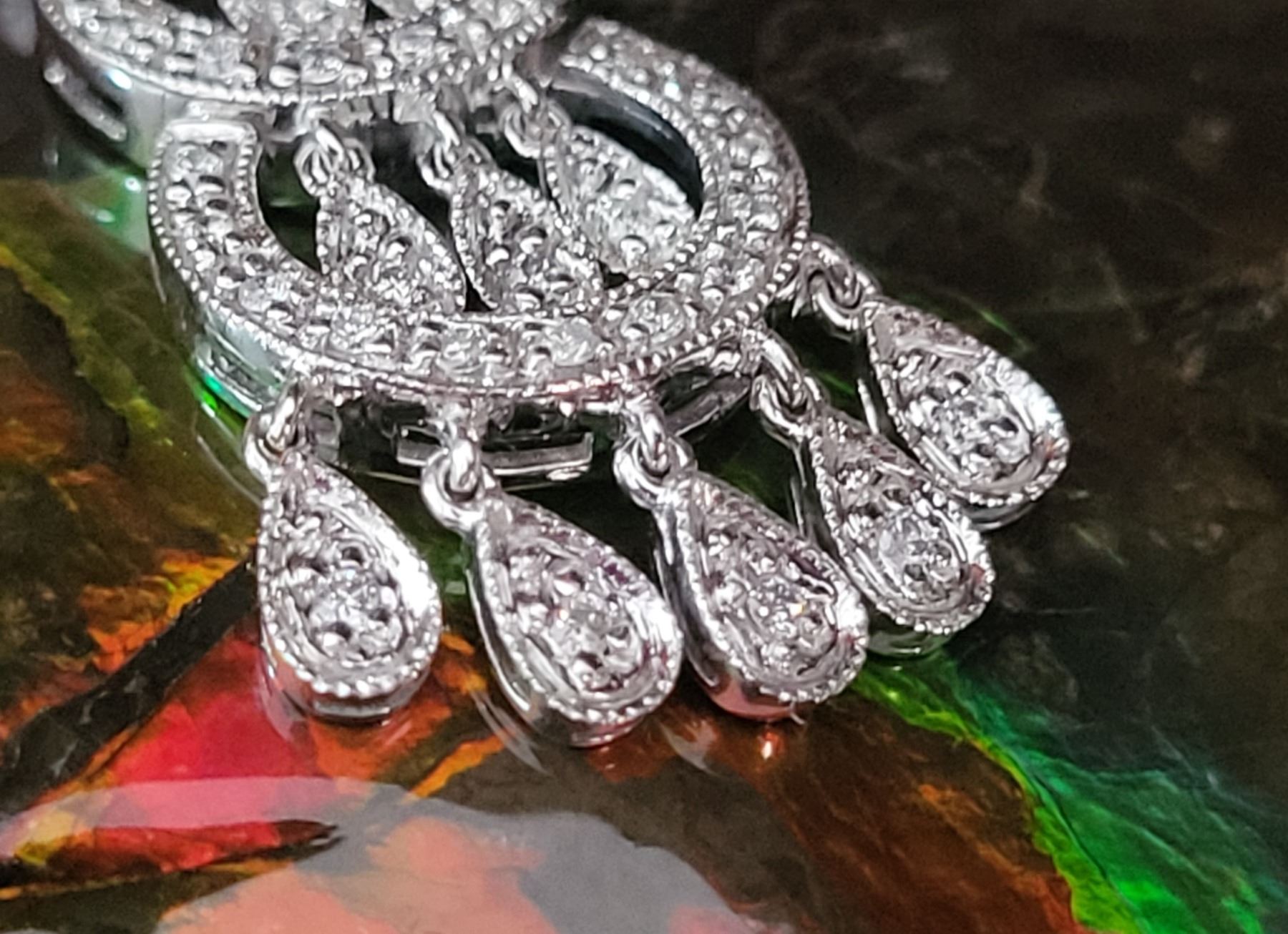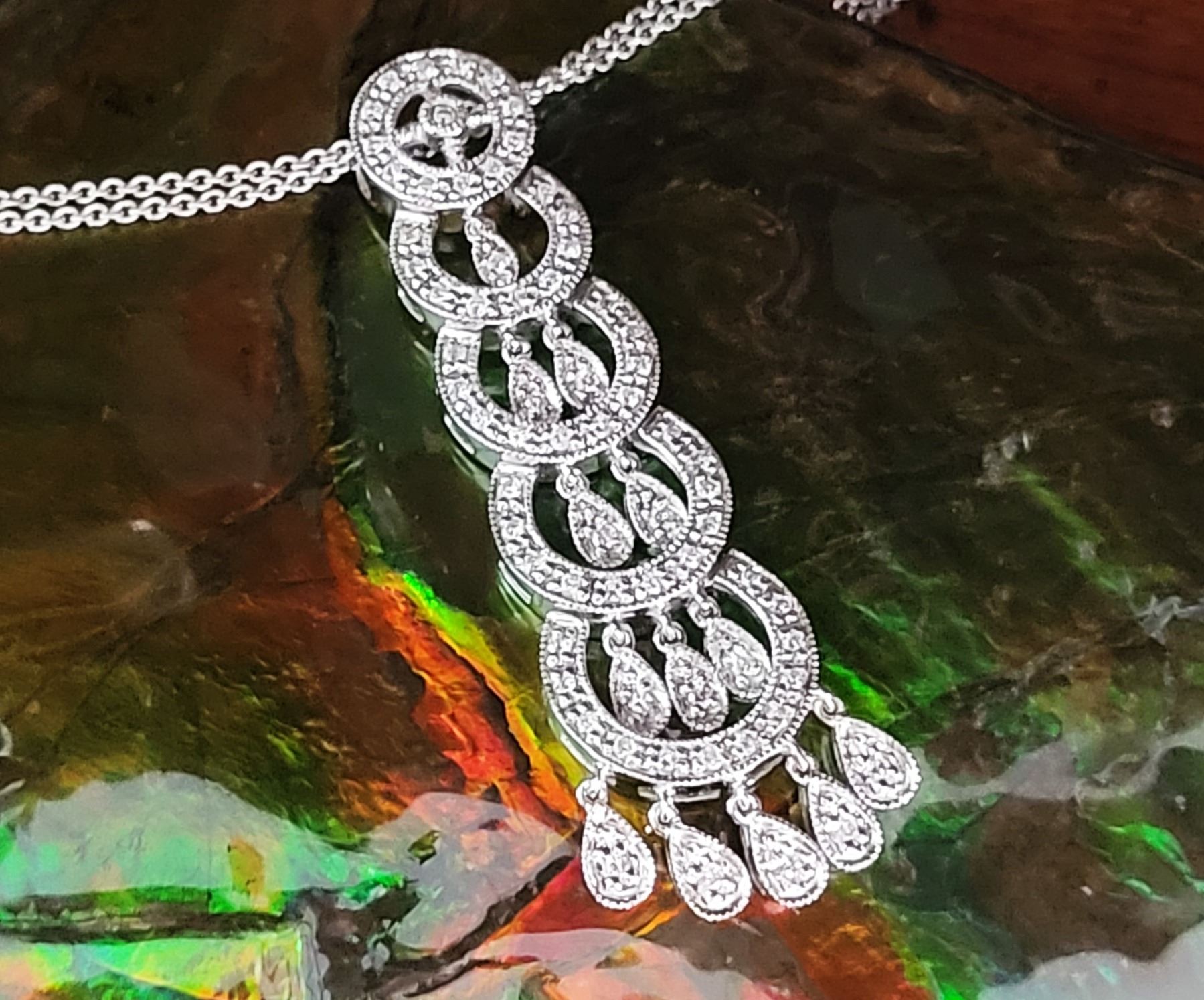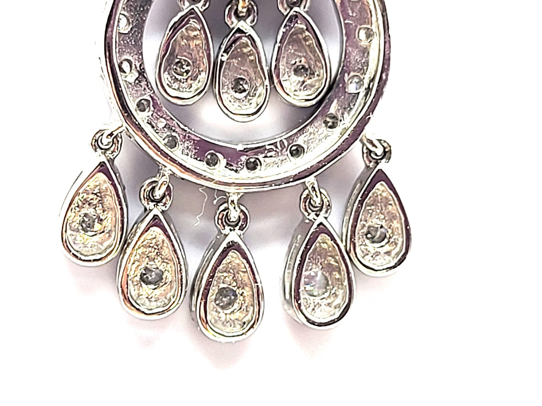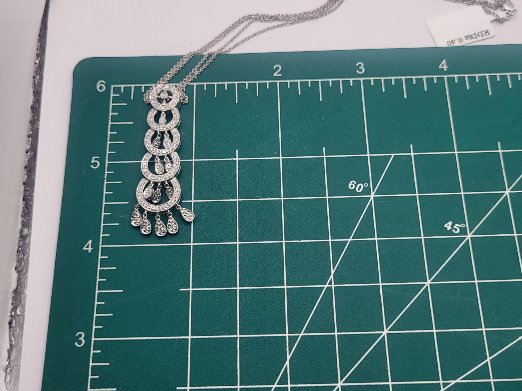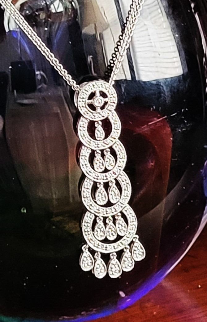 This is a 14 karat white gold necklace that features a 2& quot; pendant with fashionable concentric circles, postured vertically, increasing in size from the top to bottom. There are .40 carats total weight of round, brilliant-cut, H color, SI2-I1 clarity diamonds along the pendant in the borders , inside the circles, and on the dangling fringe. This eye-catching pendant hangs from a 16& quot; 14 karat white gold fine link double chain by a slide-style hidden bail with approximate openings of 2.4mm. The chain has a lobster clasp. Auction Code: G11241/42ent