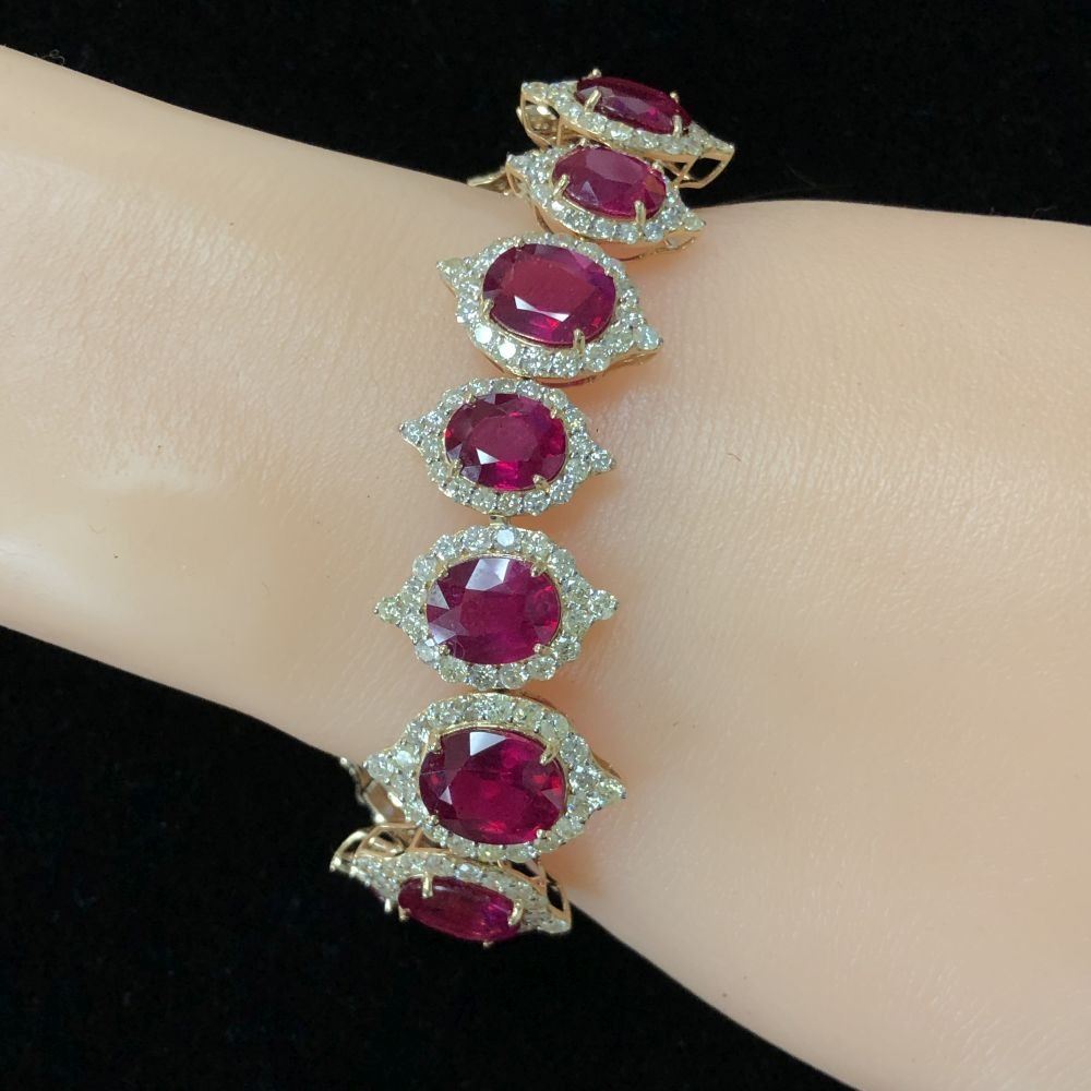 Genuine Ruby (Treated) and Earth-Mined Diamond Bracelet. This Oscar Friedman 14 karat yellow gold bracelet dazzles with 43.51 carats of oval-cut, prong-set, bright red rubies and 8.63 carats of round, brilliant-cut, I color to light yellow color, SI-I clarity diamonds in the spindle shaped halos.& nbsp; The bracelet links are hinged and stagger in size.& nbsp; The bracelet is 7.25& quot; long and has a hidden box clasp with a snap-lock bar safety latch.& nbsp; This bracelet is certified and appraised for $4,310.00 estimated retail replacement value.& nbsp; CHECK OUT THE AMAZING RUBY JEWELRY IN LOTS 142,144, AND 145 TO COMPLETE A SUITE!!