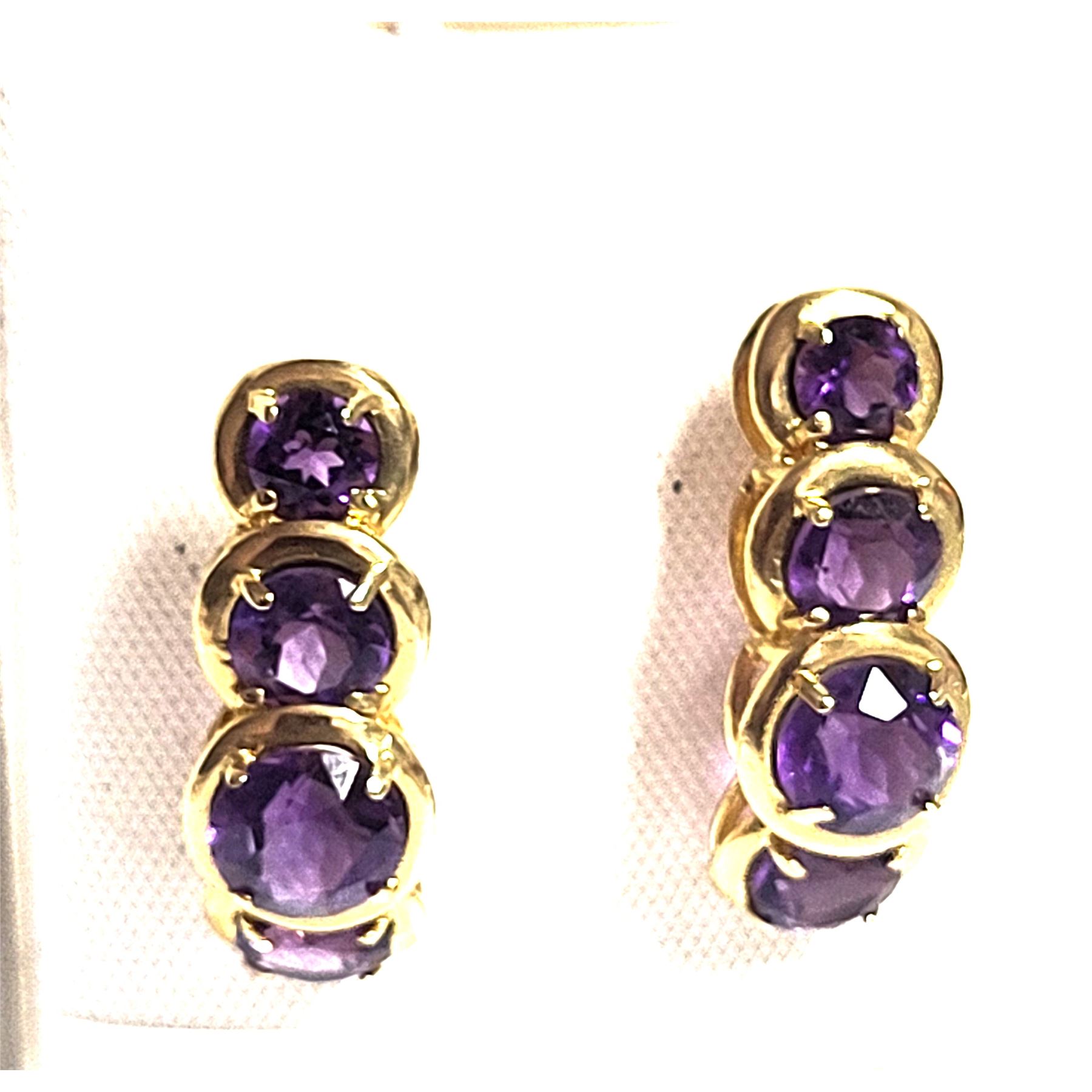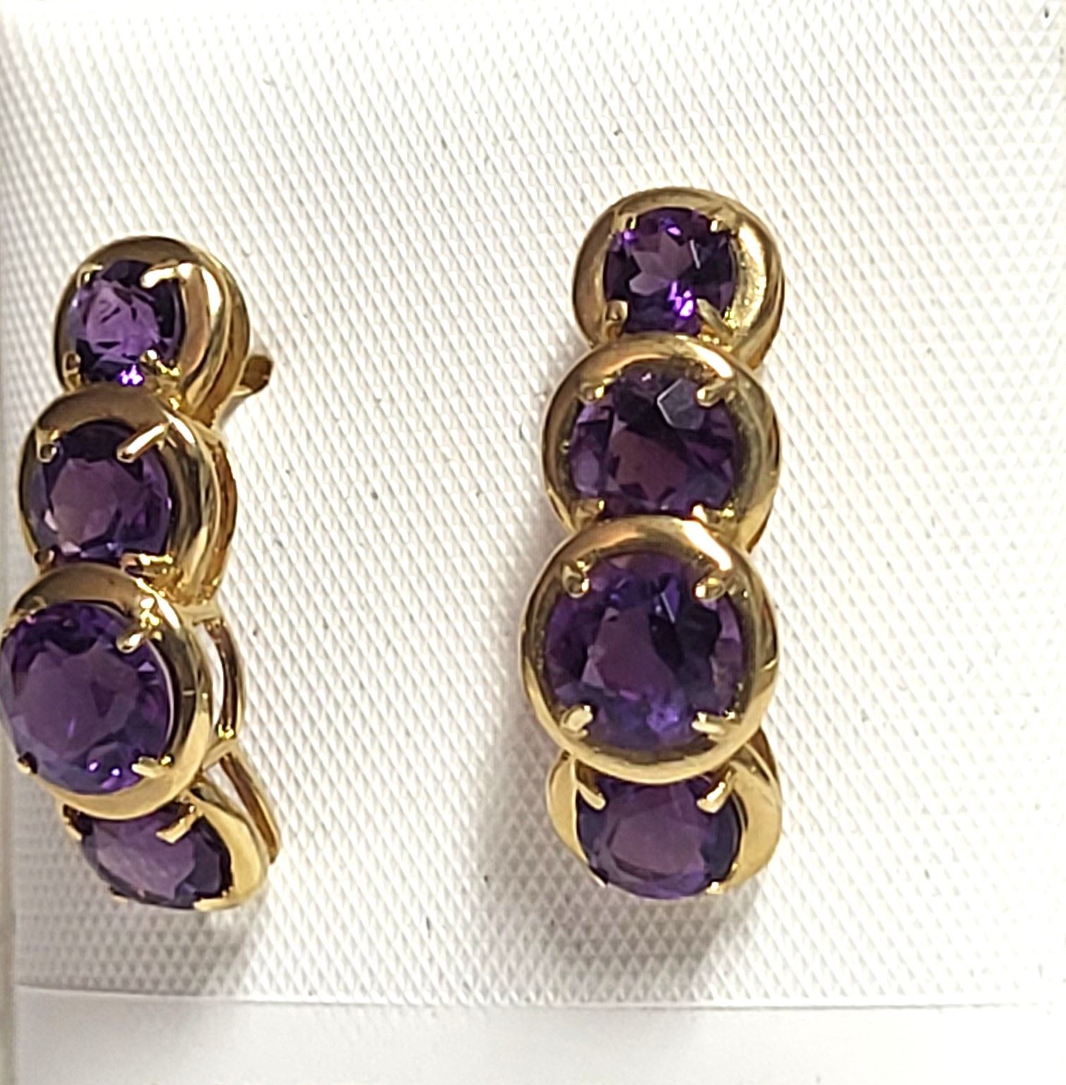 Richly-colored purple amethysts have been a favorite gems for centuries!& nbsp; These 14 karat yellow gold earrings feature approximately 4.00 carats total weight of round, faceted genuine amethysts, The earrings hang approximately7/8& quot; and attach to the earlobes with posts and friction backs, This is a brand new item that has been held in back stock. It is in excellent condition, but may have minor signs of storage, such as fine scratches or patina. Admin Code: 33109/5bra
