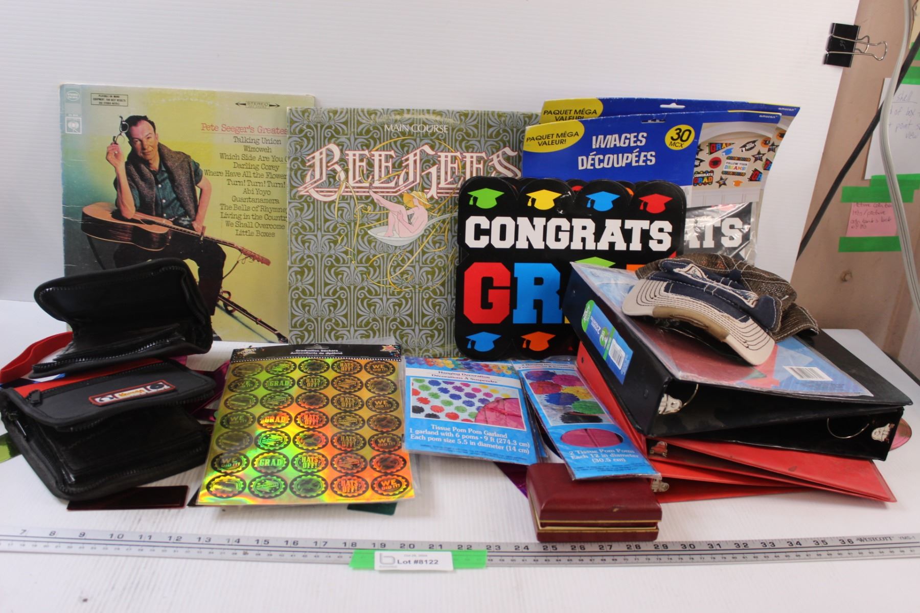 Graduation Signage, Stickers, Hanging Decorations, Red Storage Tray, (2) Kahlua Collective Beats CD Case, Jason Aldean Hat, (2) 2" Black Binders, Pack of Index Dividers, (2) 1" Red Binders, Records: Bee Gees, Pete Seeger