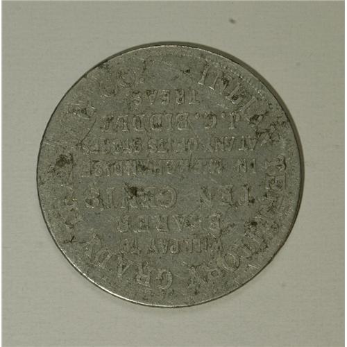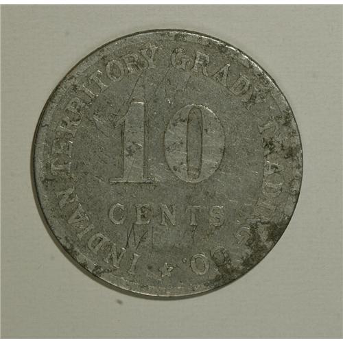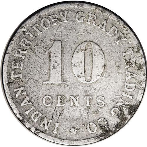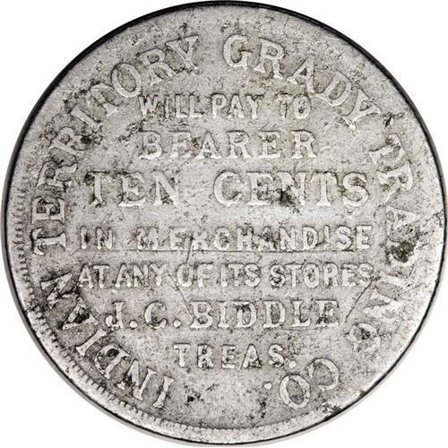<B>Grady Trading Co. Indian Territory, J.C., Biddle, Muskogee.</B></I> This is a 10 cent token issued for use in any of its stores. This aluminum token has seen better days but it is still a very scarce Indian trader's token. We expect to see spirited bidding on this lot from Territorial collectors<BR><BR><b>Shipping:</b> Coin/Currency (<a target="_blank" href="http://www.heritageauctions.com/common/shipping.php">view shipping information</a>)