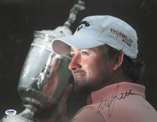 Graeme McDowell is a professional golfer from Northern Ireland who plays on both the PGA Tour and European Tour. He is well known for winning the 2010 U.S. Open at Pebble Beach, where he ended a 40-year drought for Europeans at the tournament. McDowell has won nine events on the European Tour, and two on the PGA Tour. He has also represented Ireland at the World Cup and been a member of the European Ryder Cup team on three occasions. He has appeared in the top-10 in the Official World Golf Ranking and his best ranking position is 4th. Graeme McDowell has hand signed this 11x14 Photo from the 2010 US Open. PSA Hologram and Certificate of Authenticity from Athlon Sports. Photo has minor ding, sold as is, no returns.