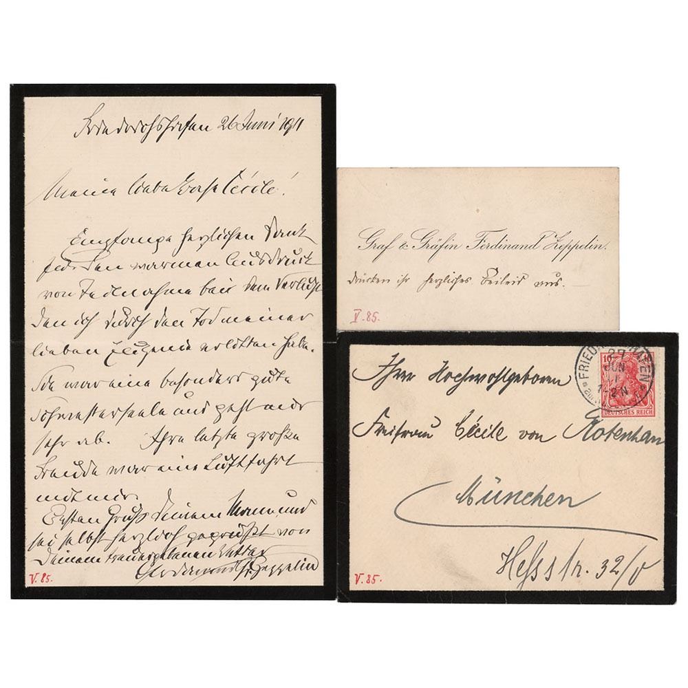 ALS in German, signed “Ferdinand Gr. Zeppelin,†one page, 4.5 x 7, June 26, 1911. Untranslated handwritten letter to Cecile von Rotenhan, with accompanying calling card and hand-addressed mailing envelope. In fine condition.