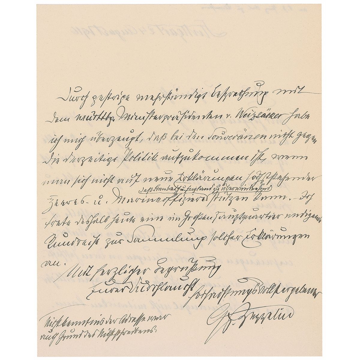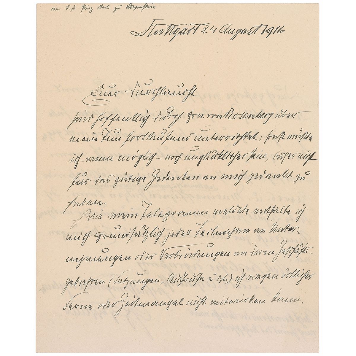 German engineer (1838–1917) who designed the famous rigid airship that bears his name. War-dated ALS in German, signed “G. v. Zeppelin,” one page, 6.25 x 7.75, August 24, 1916. Letter to Charles Prince Lowenstein, apologizing for not being able to participate in some undertakings during WWI. In fine condition.