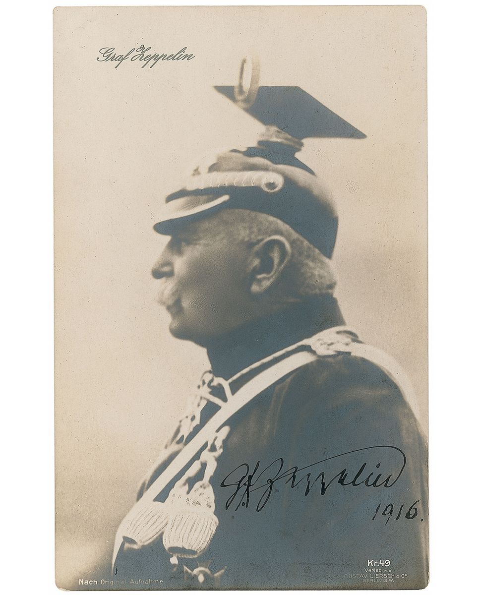 German engineer (1838–1917) who designed the famous rigid airship that bears his name. Distinguished 3.5 x 5.25 postcard photo of the famed engineer in profile, signed in black ink, “G. F. Zeppelin, 1916.” In fine condition, with silvering to darker portions of image.