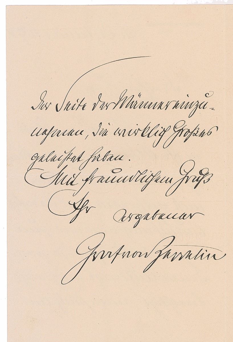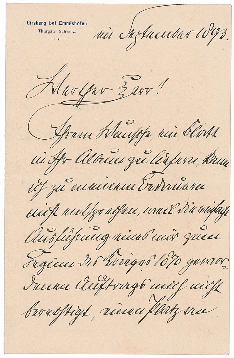 German engineer (1838–1917) who designed the famous rigid airship that bears his name. Humble ALS in German, signed “Graf von Zeppelin,” one page both sides, 4.5 x 7, Girsberg bei Emmishofen letterhead, September 1893. Zeppelin writes Dr. Gottfried Deckler. In part (translated): “To my regret, I cannot…provide you with a page for your album because my simple execution of the mission confided to me at the beginning of the war in 1870 doesn’t give me the right to occupy a position alongside those men who performed really great deeds.” In fine condition with Deckler’s collector’s stamp on the reverse of an adjacent page. Accompanied by an 11.25 x 8.25 polychrome postcard showing an airship flying over a picturesque town and an enthusiastic crowd. Zeppelin studied French balloons during the Franco-Prussian War.