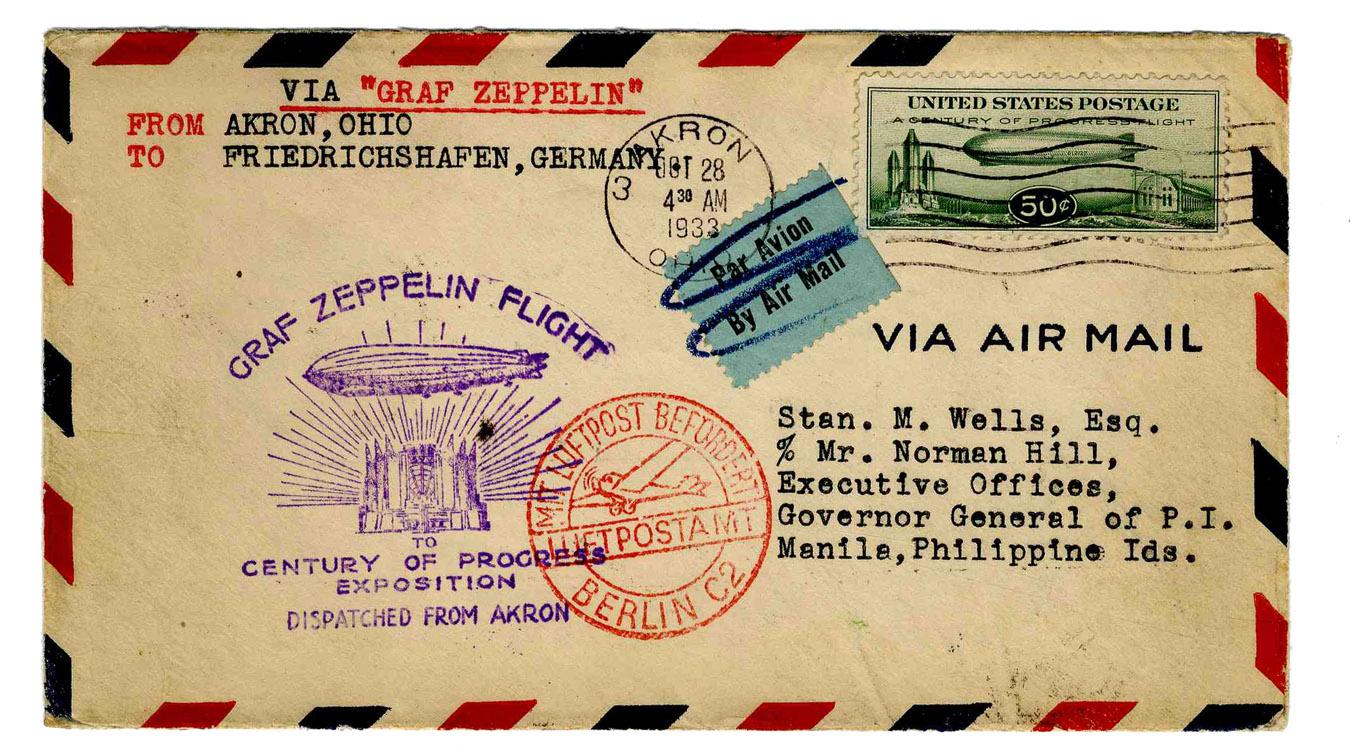 Noteworthy 6.5'' x 3.5'' envelope flown on the renowned Graf Zeppelin, featuring a coveted #C18 ''Baby Zep'' stamp. Postmarked 28 October 1933 in Akron, Ohio and addressed to the Philippines Governor General's office and backstamped in Berlin, Athens, Hong Kong, Saigon, and Manila, its final destination. Envelope has light wear to edges and expected toning throughout. Near fine.