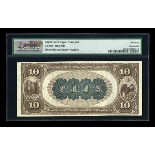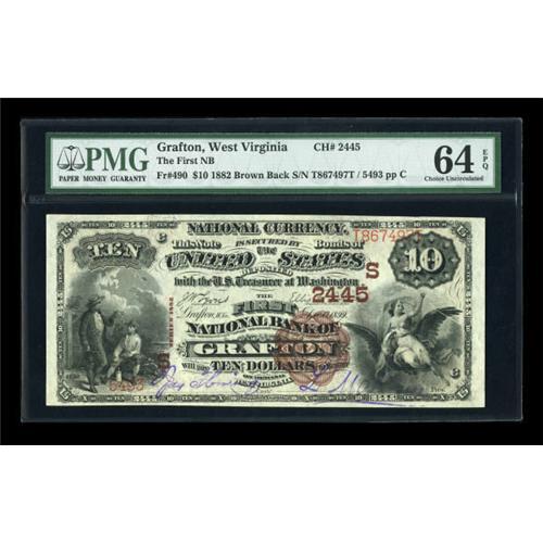 <B>Grafton, WV</B></I> - $10 1882 Brown Back Fr. 490 <B>The First NB</B></I> Ch. # (S)2445<BR> This <B>PMG Choice Uncirculated 64 EPQ</B></I> is one of only two of this type and denomination documented in the Kelly census from here. Indeed, under 50 $10 Brown Backs are known from the entire state. This is the only uncirculated example listed in the census. The margins are attractive and signatures bright. We expect to see a final realization of no less than...<BR><BR><b>Shipping:</b> Coins & Currency (<a target="_blank" href="http://www.heritageauctions.com/common/shipping.php">view shipping information</a>)