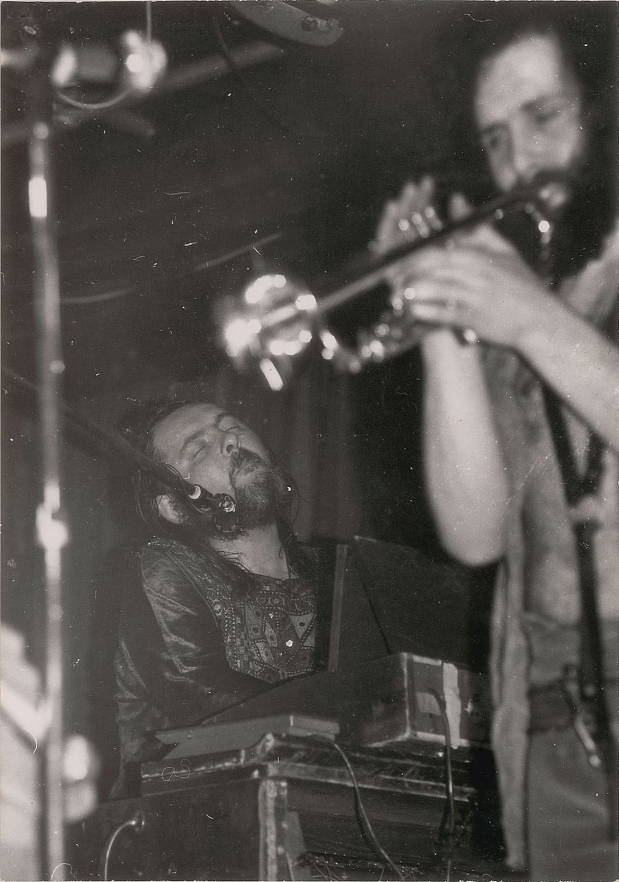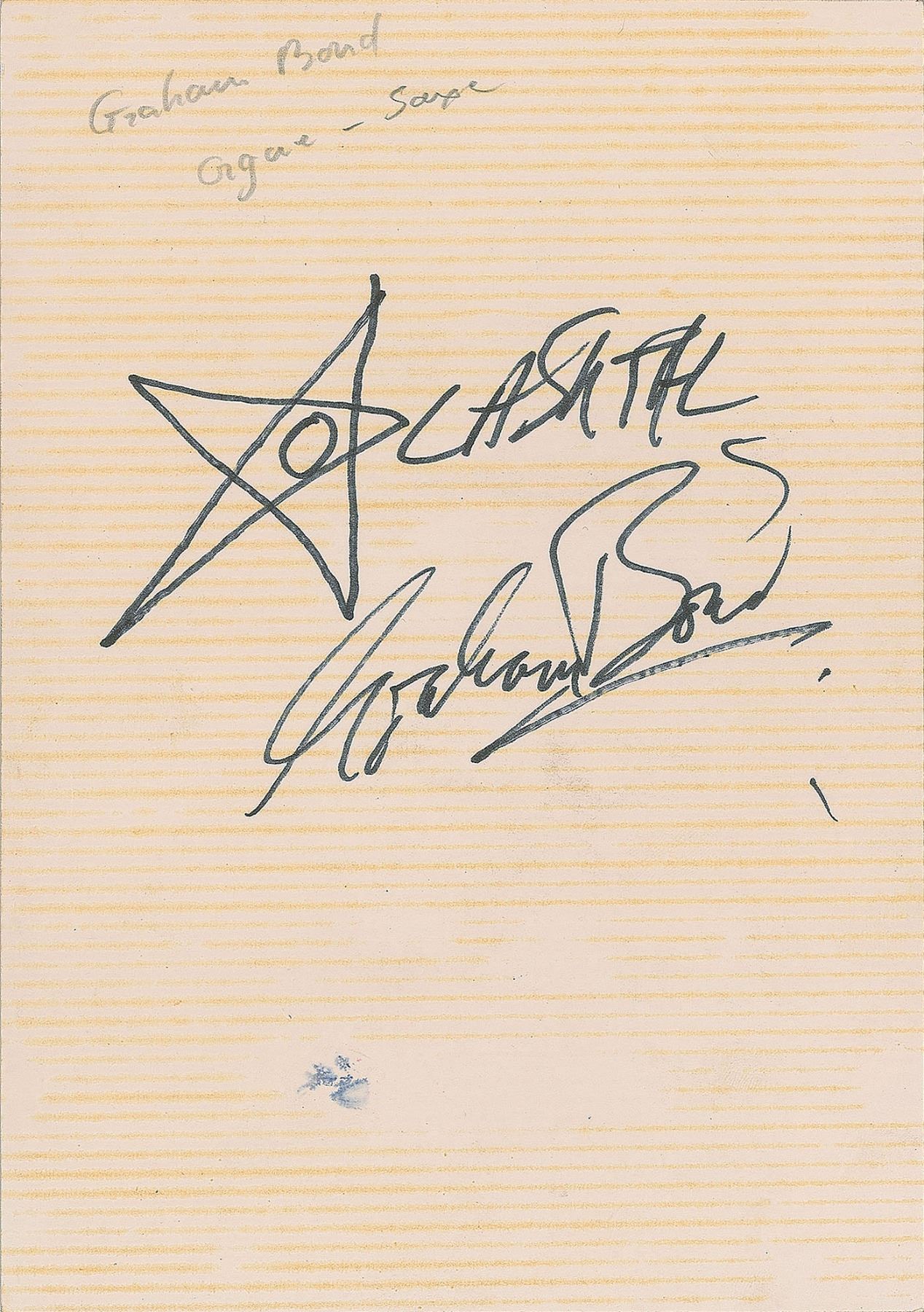English musician and occultist (1937–1974) who headed The Graham Bond Organisation and is considered a founding father of the English rhythm and blues boom of the 1960s. Scarce glossy 4.75 x 7 photo of Bond with his eyes closed, playing a Hammond organ during a live performance, signed on the reverse in black felt tip, with Bond adding a pentagram and writing "LAShTAL." In fine condition, with light stain lines from onetime storage in a magnetic photo album.
