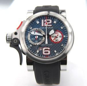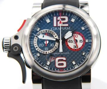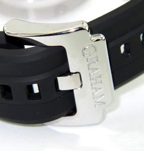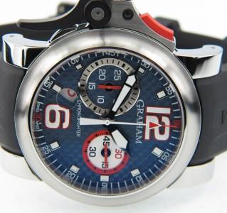 Graham Chronofighter Oversize Trigger Chronograph Stainless Steel Men's Watch.The total watch's weight is 157.7 grams.The measurements of watch head is 35 x 43 mm and 10 mm thick.The length of watch: 10". Case: Solid Stainless Steel. Band: Black Rubber. Crystal: Sapphire. Water Resistant. Swiss made.