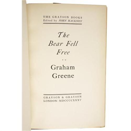 <B>Graham Greene: Signed Limited Edition of <I>The Bear Fell Free</B></I></B></I> (London: Grayson & Grayson, 1935), first edition, unpaginated, brown cloth with gilt titles, 8vo (5.75" x 8.75"), dust jacket. Numbered 57 of 285 limited edition copies and signed "<I>Graham Greene</B></I>" on the colophon page. Minor edge, corner, and spine wear, plus toning to the endpapers, else very good. The dust jacket shows age-toning, as well, plus mild edge wear, including chipping at the corners and spine ends, else very good.<BR><BR><b>Shipping:</b> Books & Catalogs (<a target="_blank" href="http://www.heritageauctions.com/common/shipping.php">view shipping information</a>)