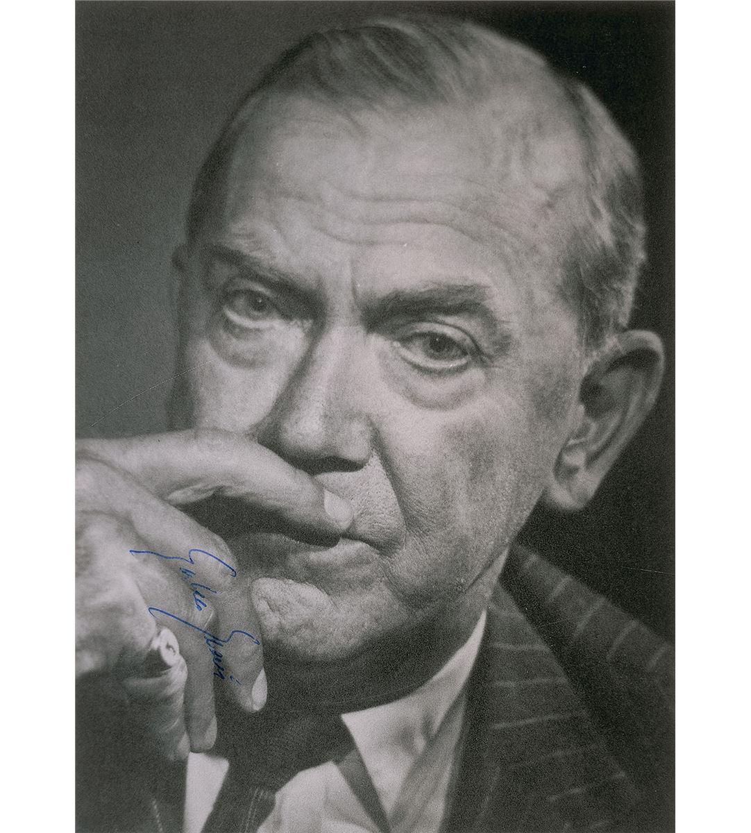 Attractive satin-finish 5 x 7 photo of Greene in a thoughtful pose, signed vertically in blue ballpoint. In fine condition, with a trivial scratch to left side.