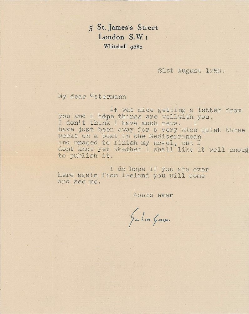 TLS, one page, 6.25 x 7.75, 5 St. James's Street letterhead, August 21, 1950. Letter to Robert Ostermann, in full: "It was nice getting a letter from you and I hope things are well with you. I don't think I have much news. I have just been away for a very nice quiet three weeks on a boat in the Mediterranean and managed to finish my novel, but I don't know yet whether I shall like it well enough to publish it. I do hope if you are over here again from Ireland you will come and see me." In fine condition. Ostermann's interview with Greene, originally printed in the February 1950 issue of Catholic World, was later published in the books Conversations with Graham Greene and Graham Greene: Man of Paradox. The "novel" Greene references is likely The End of the Affair, which was published by Heinemann in 1951.