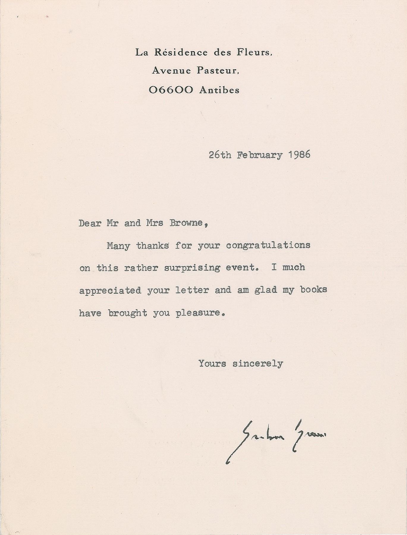 TLS, one page, 6 x 7.75, personal letterhead, February 26, 1986. Letter to "Mr. and Mrs. Browne," in full: "Many thanks for your congratulations on this rather surprising event. I much appreciated your letter and am glad my books have brought you pleasure." In fine condition, with a few light creases.