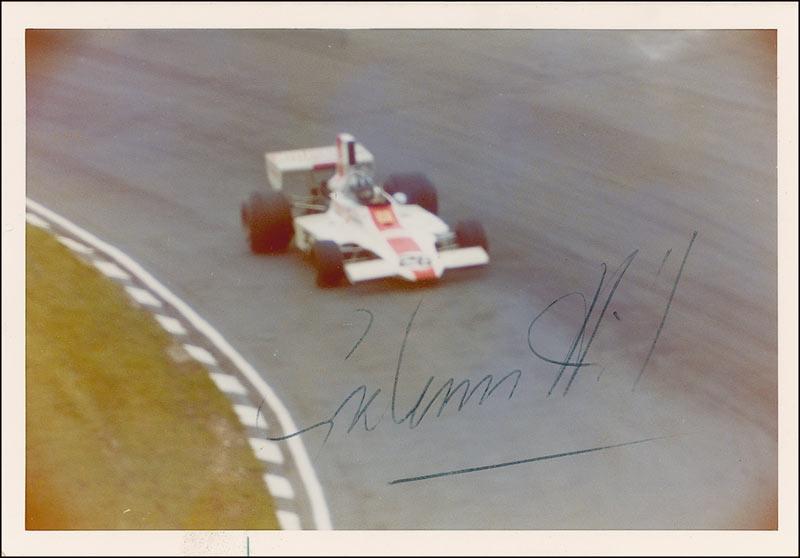 Color glossy 5 x 3 candid photo of Hill on the racetrack, signed in blue ballpoint “Graham Hill.” In fine condition.