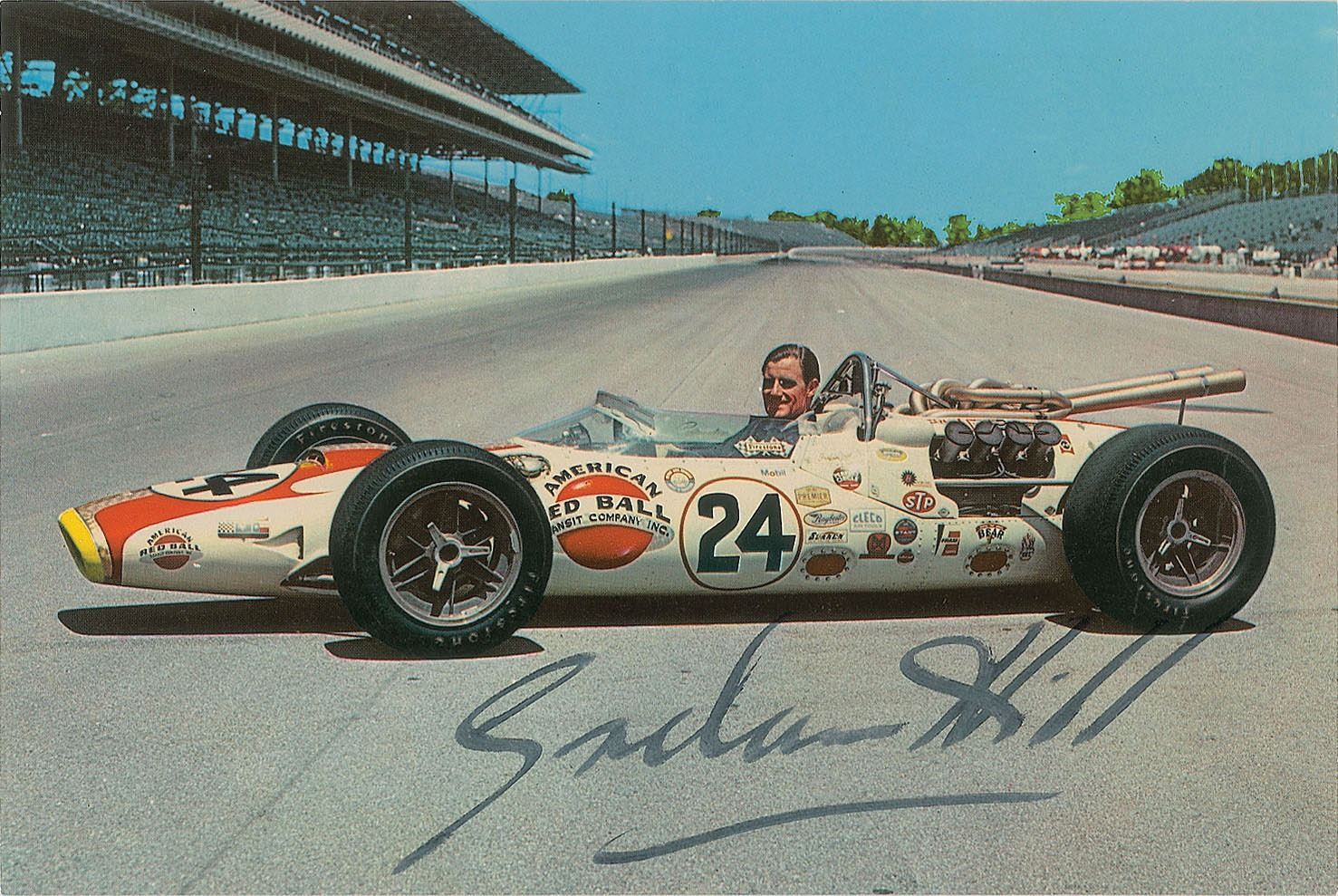 British racing driver (1929–1975) who was twice the Formula One World Champion. He is the only driver ever to win the Triple Crown of Motorsport—the 24 Hours of Le Mans, Indianapolis 500, and the Monaco Grand Prix. Color glossy 9 x 6 jumbo postcard photo of Hill seated in his Lola-Ford T90 'Red Ball Special' race car, the same vehicle he used to win the 1966 Indianapolis 500 as a rookie, signed prominently in black felt tip. In fine condition, with some light edge creasing.