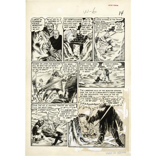 <B>Graham Ingels - Vault of Horror #22, page 6 Original Art (EC Comics, 1951)</B></I> Imagine if you will, the Frankenstein monster, in a story drawn by "Ghastly "Graham Ingels -- it's enough to make any EC horror fan's drool-cups overflow! The monster lumbers into the scene on the final panel of this wind-swept page. Feel that chill? It's not the arctic backgrounds -- it's the inspired brushwork of "Ghastly," the EC horror legend! This page from "The Monster in the Ice" has an image area of 13" x 18", and the art is in Excellent condition.
