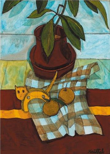 TOY CAT AND PLANT ON TABLE signed lower right watercolour and charcoal on paper <BR>74 by 53cm., 29 by 21in.