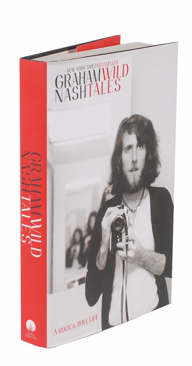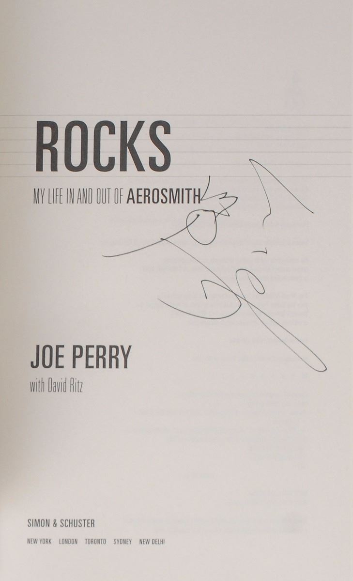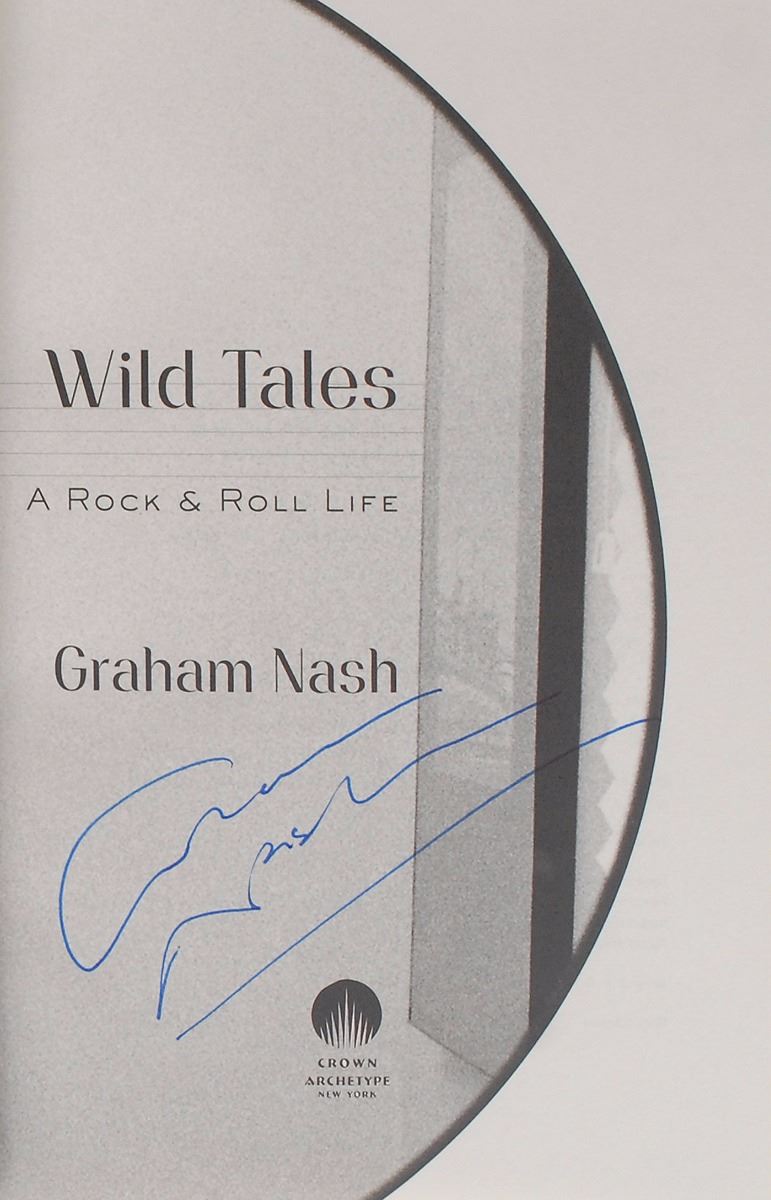 Two hardcover books: a first edition, first printing of Rocks: My Life In and Out of Aerosmith, signed on the title page in black ink by Joe Perry; and a first edition of Wild Tales, signed on the title page in blue ink by Graham Nash. In overall fine condition. Accompanied by an advertisement for a Joe Perry book signing at the Rock and Roll Hall of Fame Museum on October 14, 2014, and a ticket from the Nash signing event.