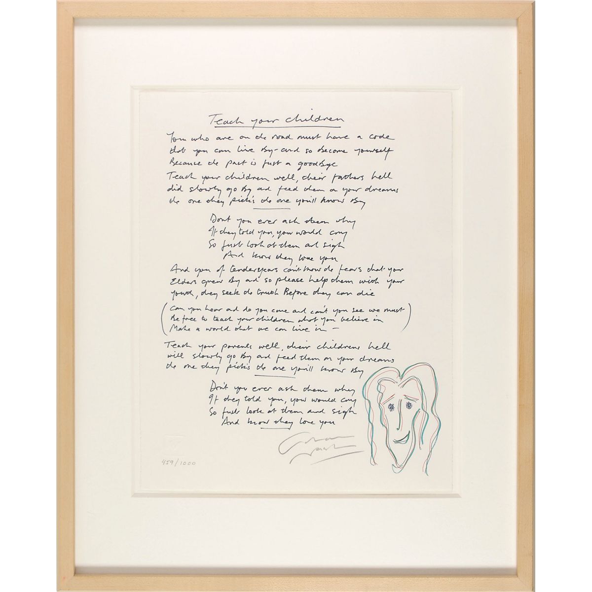 Color limited edition 11 x 14 lithograph entitled ‘Teach Your Children,’ featuring the lyrics to the song, numbered 459/1000, signed in pencil by Nash. Matted and framed to an overall size of 17 x 21. In very fine condition.