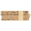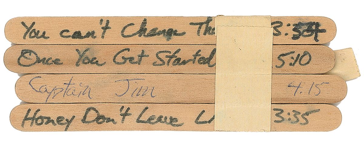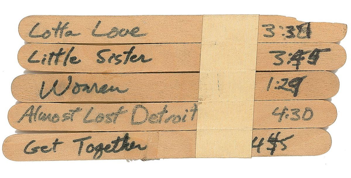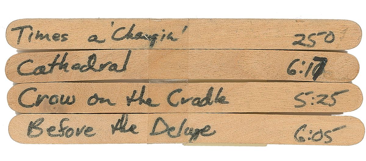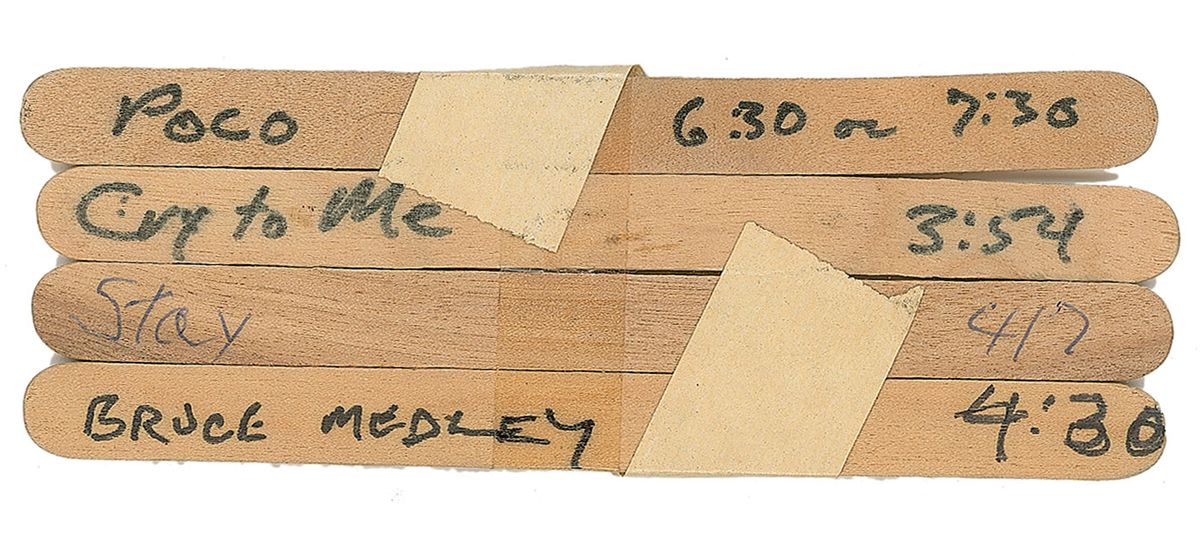 Phenomenal one-of-a-kind handwritten track list by co-producer Graham Nash for the first five sides of the 1979 No Nukes triple live album, on 22 individual popsicle sticks, which Nash has grouped together using masking tape to represent each side of the album. Nash has written one song and its running time on each stick, including, ‘The Times They Are a’Changin’,’ performed by James Taylor, Carly Simon, and Graham Nash; ‘Before the Deluge’ performed by Jackson Browne; ‘Little Sister’ performed by Ry Cooder; ‘Captain Jim’s Drunken Dream,’ performed by James Taylor; and ‘Detroit Medley,’ performed by Bruce Springsteen and the E Street Band, labeled by Nash, “Bruce Medley.” The sixth side was entirely Crosby, Stills, and Nash, so Nash may have sequenced it without sticks. In fine condition. Accompanied by a letter of authenticity from longtime Crosby, Stills, and Nash road manager R. Mac Holbert, who kept the sticks in his personal collection. Letter reads, in part: “Graham wrote out the title for each song on a popsicle stick, arranging the sticks in order and then taping them down on the back once the order had been determined.” The No Nukes album contained selections from the series of September 1979 Madison Square garden concerts, organized by Nash, Jackson Browne, Bonnie Raitt, and John Hall. A simplistic, yet effective, tool used to make the collective’s certified gold album.