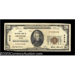<TABLE cellSpacing=0 cellPadding=0 width="100%" bgColor=#000000 border=0><TBODY> <TR><TD width="100%"><TABLE cellSpacing=1 cellPadding=3 width="100%" border=0><TBODY><TR><TD width="100%" bgColor=#79735c><FONT face=arial color=#ffffff size=3><B>Description</B> </FONT></TD></TR><TR><TD width="100%" bgColor=#ffffff><FONT face=arial size=2><B>Graham, TX</B></I> - $20 1929 Ty. 1 <B>First NB</B></I> Ch. # 4418<BR>This Type 1 $20 has a slightly uneven margin at the bottom, but is otherwise quite attractive. <B>Fine-Very Fine.</B></I> (250-350 ) </FONT></TD></TR></TBODY></TABLE></TD></TR></TBODY></TABLE><BR><TABLE cellSpacing=0 cellPadding=0 width="100%" bgColor=#000000 border=0><TBODY><TR> Important notice: Heritage usually auctions material at the rate of 200-250 lots per hour. On some occasions eBay Live bid software or the Internet may not be able to keep up with the pace of the auction. We recommend placing a realistic absentee bid now as insurance to avoid disappointment. Occasionally the auctioneer may eliminate or reject an eBay Live bid, and the auctioneer may also reopen a lot after the close of the eBay live bidding (usually because we missed an audience bid), and may reject your bid even if it shows you as the winning bidder. By bidding via eBay Live, you agree that Heritage may award the lot to another bidder at its sole discretion under the circumstances described above or any other reasonable circumstances. Also please note that all Heritage lots purchased through eBay Live carry a 20% Buyer's Premium. Please make sure you read the Terms and Conditions before you bid.</TR></TBODY></TABLE>
