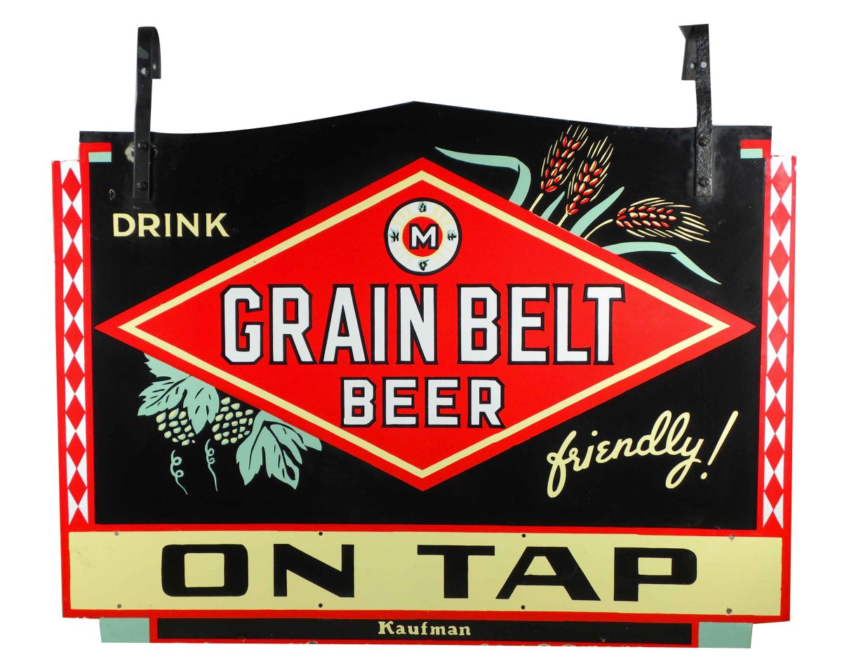 Grain Belt Beer Two Sided Porcelain Sign. Die cut with original hanging brackets. Kaufman Sign Company. Fabulous color and graphics. Excellent condition. 48 X 36 inches.