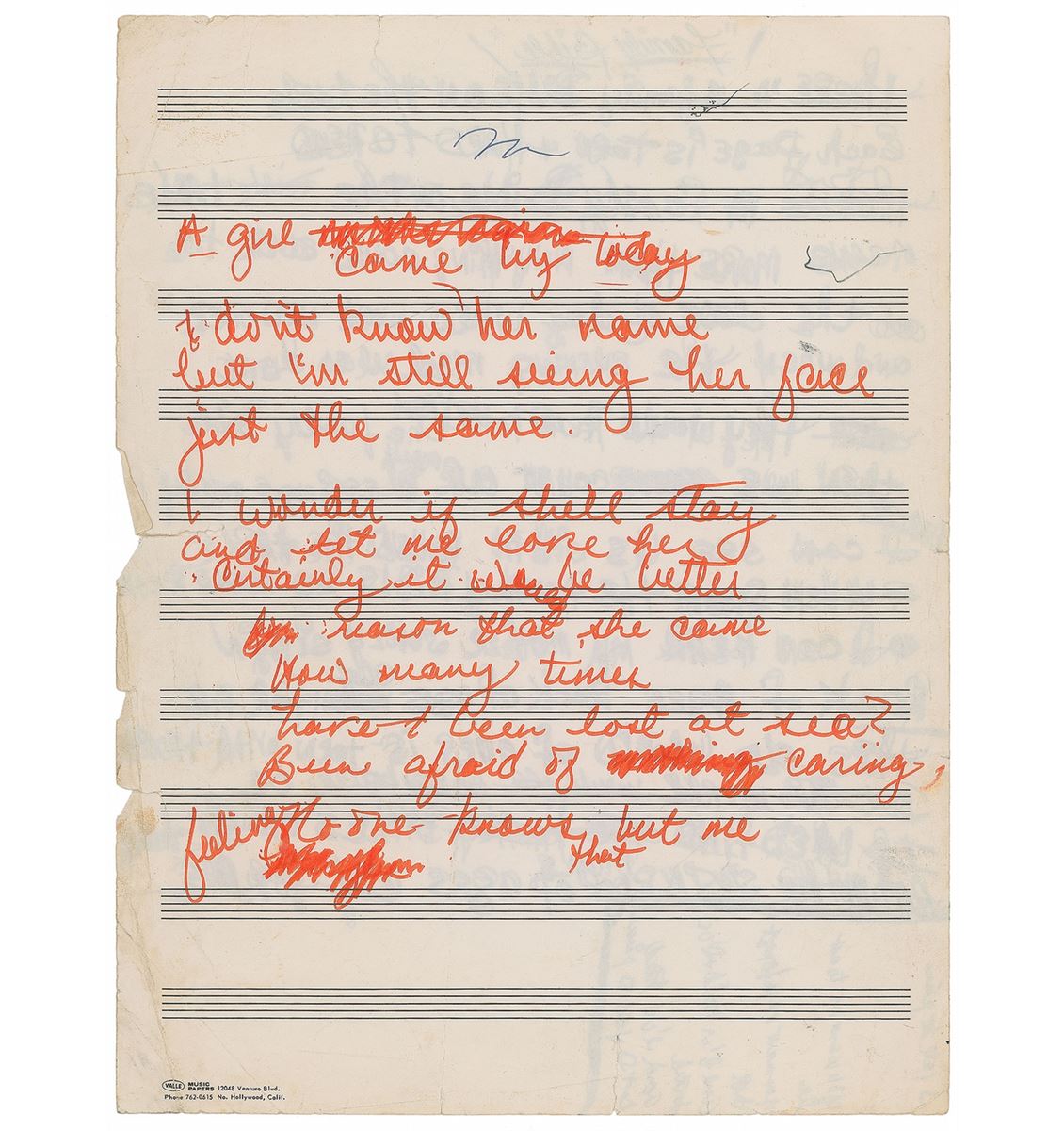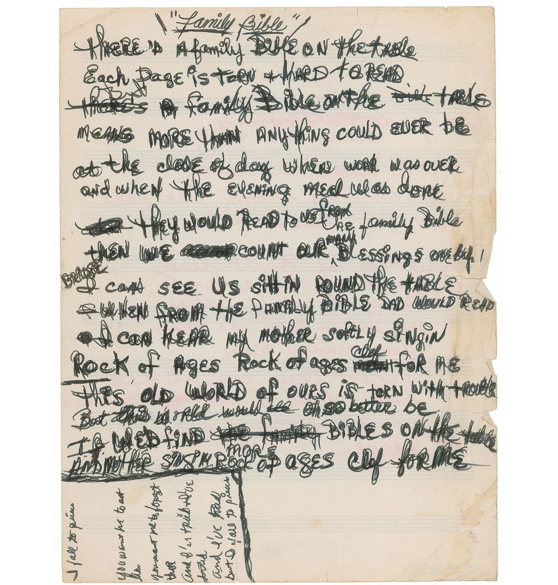 Handwritten lyrics to three songs, including one which appears to be an unpublished Parsons original work, on both sides of a 9.5 x 12.5 musically-lined sheet. On one side, Parsons has penned slightly modified lyrics to Willie Nelson’s song ‘Family Bible,’ as well as a few lines from ‘I Fall to Pieces.’ On the reverse, Parsons has written 12 lines of working lyrics to an original unpublished song. The lyrics to the untitled song read: “A girl came by today / I don’t know her name / but I’m still seeing her face / just the same. / I wonder if she’ll stay / and let me love her / Certainly it would be better / reason that she came / How many times / have I been lost at sea? / Been afraid of caring / feeling no one knows that but me.” The majority of the opposite side bears 16 lines of Nelson’s ‘Family Bible,’ each line written over several times in black felt tip, with six lines of Cline’s song in the lower left corner. In very good condition, with small edge tears and creases, some stray ink marks, and scattered toning along one vertical edge.