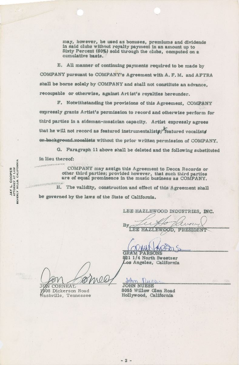 Rare DS, two onionskin pages, 8.5 x 13, July 11, 1967. An addendum to a five-year agreement between Lee Hazlewood Industries and Gram Parsons, John Nuese, and Jon Corneal, in which the latter party agree “to record…commercially satisfactory ‘master’ records of at least six (6) record sides at 45 rpm.” Signed at the conclusion in blue or black ballpoint by Parsons, Nuese, and Corneal, and countersigned by Hazlewood. In fine condition. After an amicable separation in 1966, Parsons reformed the International Submarine Band a year later with new drummer Jon Corneal. Backed by Hazlewood’s label, the band recorded their first single—’Luxury Liner / Blue Eyes’—in July of that year before returning to the studio to record their only full-length album, Safe at Home. An intriguing piece of rock history from the elusive Parsons.