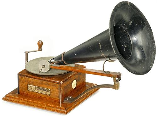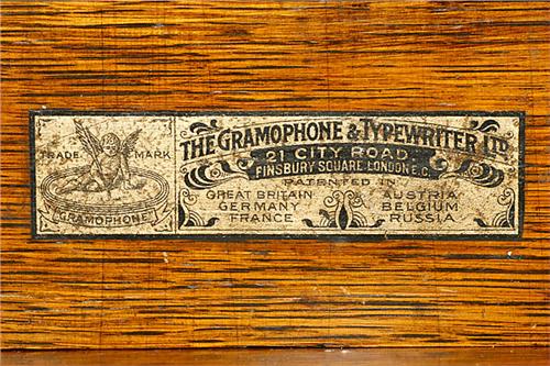 Grammophon "Emil Berliner", um 1900 Hersteller: "Gramophone & Typewriter Ltd., London", Eichengehäuse, Schalldose Nr. 18425, offenes Federwerk, unrestaurierter Originalzustand.