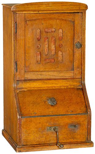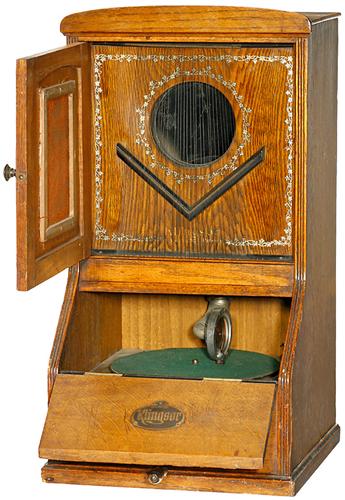 Grammophon "Klingsor", um 1920 Hersteller: "Krebs & Klenk, Hanau", Eichengehäuse: 35 x 35 x 68 cm, Original-Schalldose. Funktioniert. - Sehr dekorativ!
