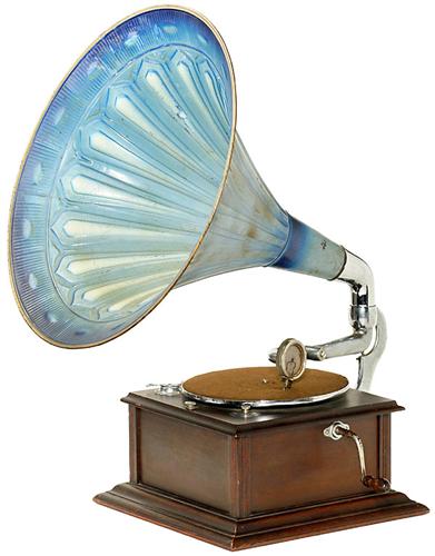 Gramophone "Regal", c. 1925 English gramophone with Swiss soundbox "The Crescendo Junior Sound Box", metal horn with original blue paint, oak case, very nice original condition - fully working.<Br>