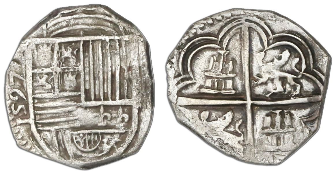 Granada, Spain, cob 2 reales, 1597 date to left (assayer F to right not visible), rare. CT-469. 6.72 grams. Full date to left of choice full shield, nice and nearly full cross, small-flan XF+ with light toning in crevices.