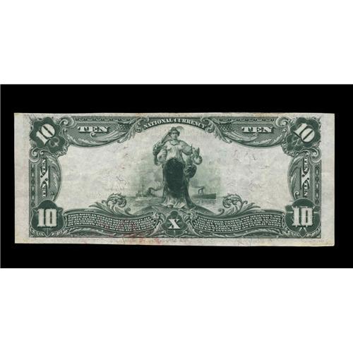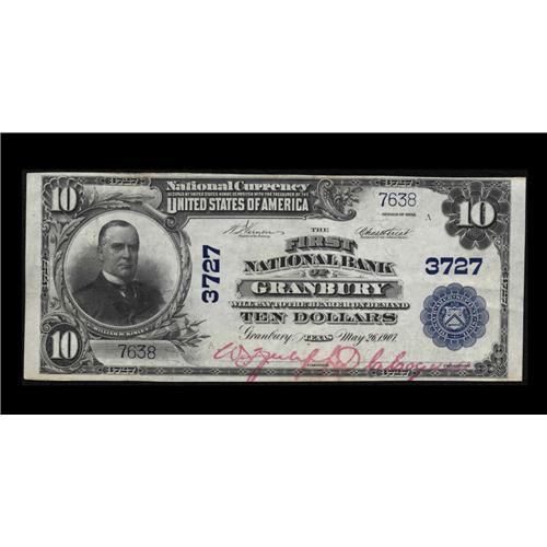 <B>Granbury, TX</B></I> - $10 1902 Plain Back Fr. 626 <B>The First NB</B></I> Ch. # 3727<BR>This is a bright, well centered note with a pair of barely discernible pinholes just to the left of McKinley's portrait. This note's most distinctive feature is its neon-pink stamped signatures of W.F. Juliff and D.C. Cogdell, a portion of which has bled through to the back. The Hood County town of Granbury is a hard day's ride southwest of Fort Worth and was dominated by the First, which was chartered in June 1887. The Kelly census lists 17 Large, with this note being the second highest graded note outside of the notes locked away in the Philpott/Moody Foundation. <B>Extremely Fine-About Uncirculated.</B></I>