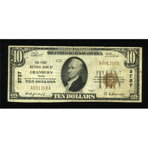 <B>Granbury, TX</B></I> - $10 1929 Ty. 1 <B>The First NB</B></I> Ch. # 3727<BR> A slight amount of staining is noticed on this otherwise problem free <B>Fine-Very Fine</B></I>.<BR><BR><b>Shipping:</b> Coins & Currency (<a target="_blank" href="http://www.heritageauctions.com/common/shipping.php">view shipping information</a>)